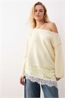 Пушистый асимметричный джемпер с контрастным атласным кружевным подолом
