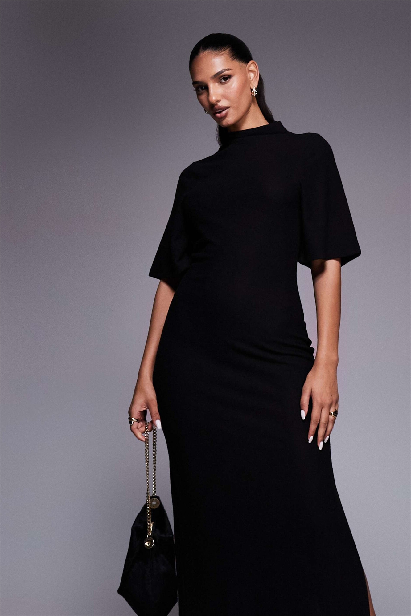 Макси-платье с высоким воротником и короткими рукавами