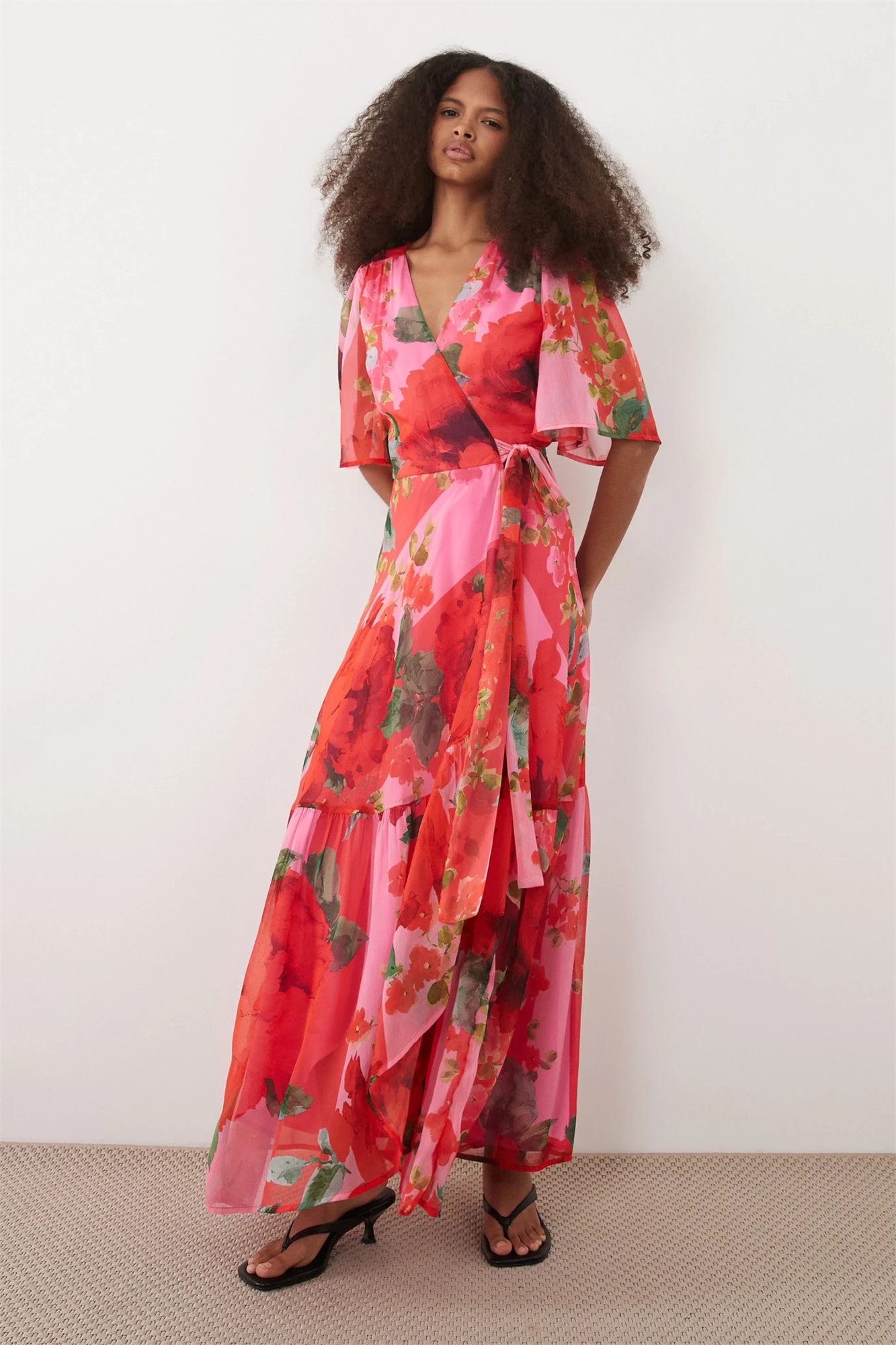 Макси-платье с запахом, с оборками на рукавах и завязкой на талии