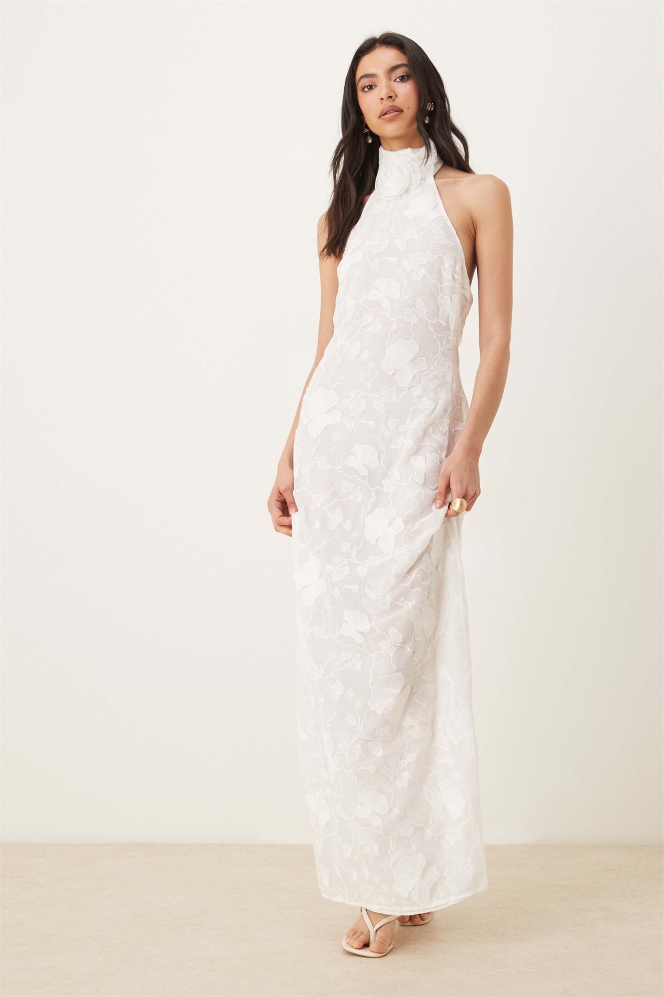 Макси-платье с вырезом за шеей, декором на груди и открытой спиной, украшенное цветочной вышивкой