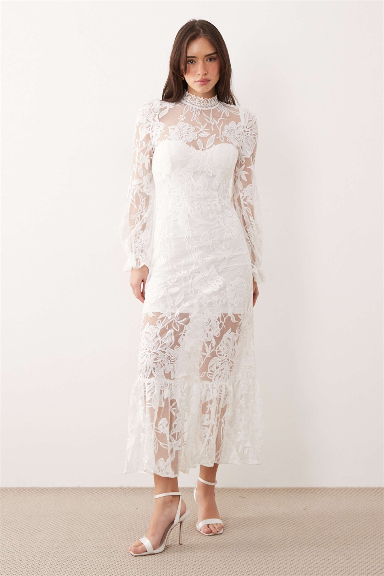 Макси-платье с высоким воротником, кружевом и длинными рукавами