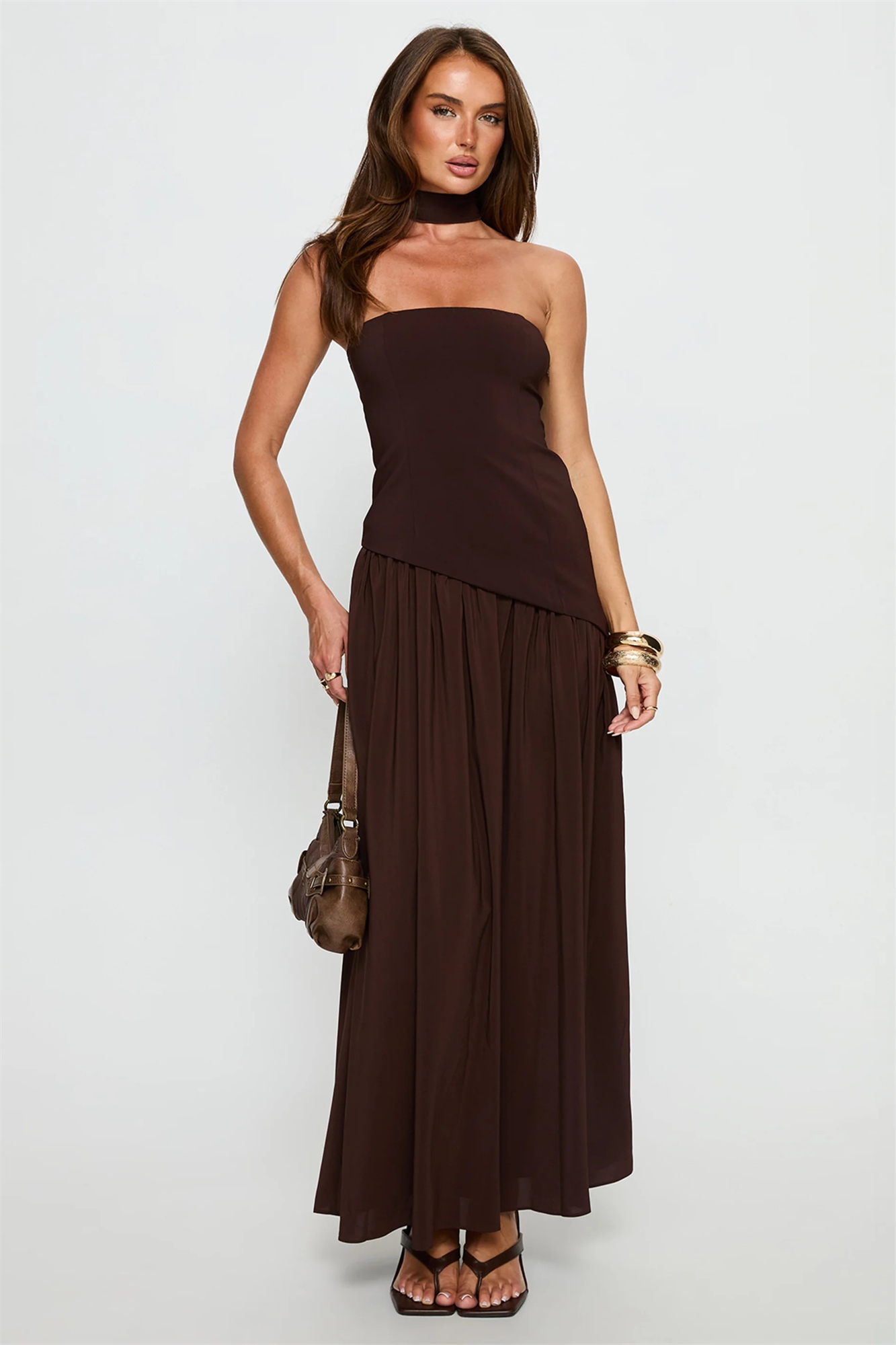 Макси-платье с бандо, шифоновым подолом и декором в виде шарфа, скроенное по фигуре