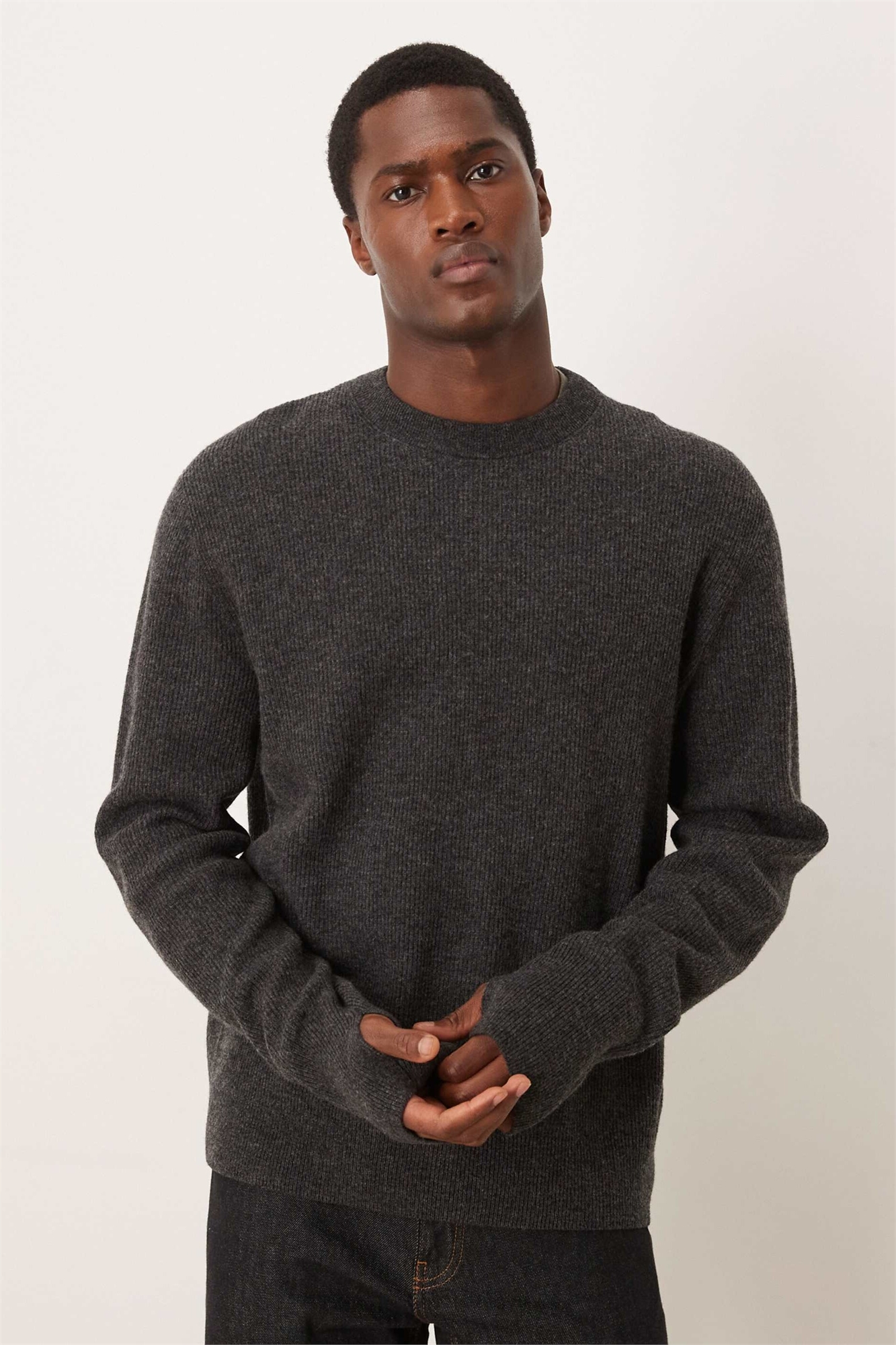 Теплый шерстяной свитер с круглым вырезом и ребристой отделкой, с манжетами на запястьях и отверстиями для больших пальцев