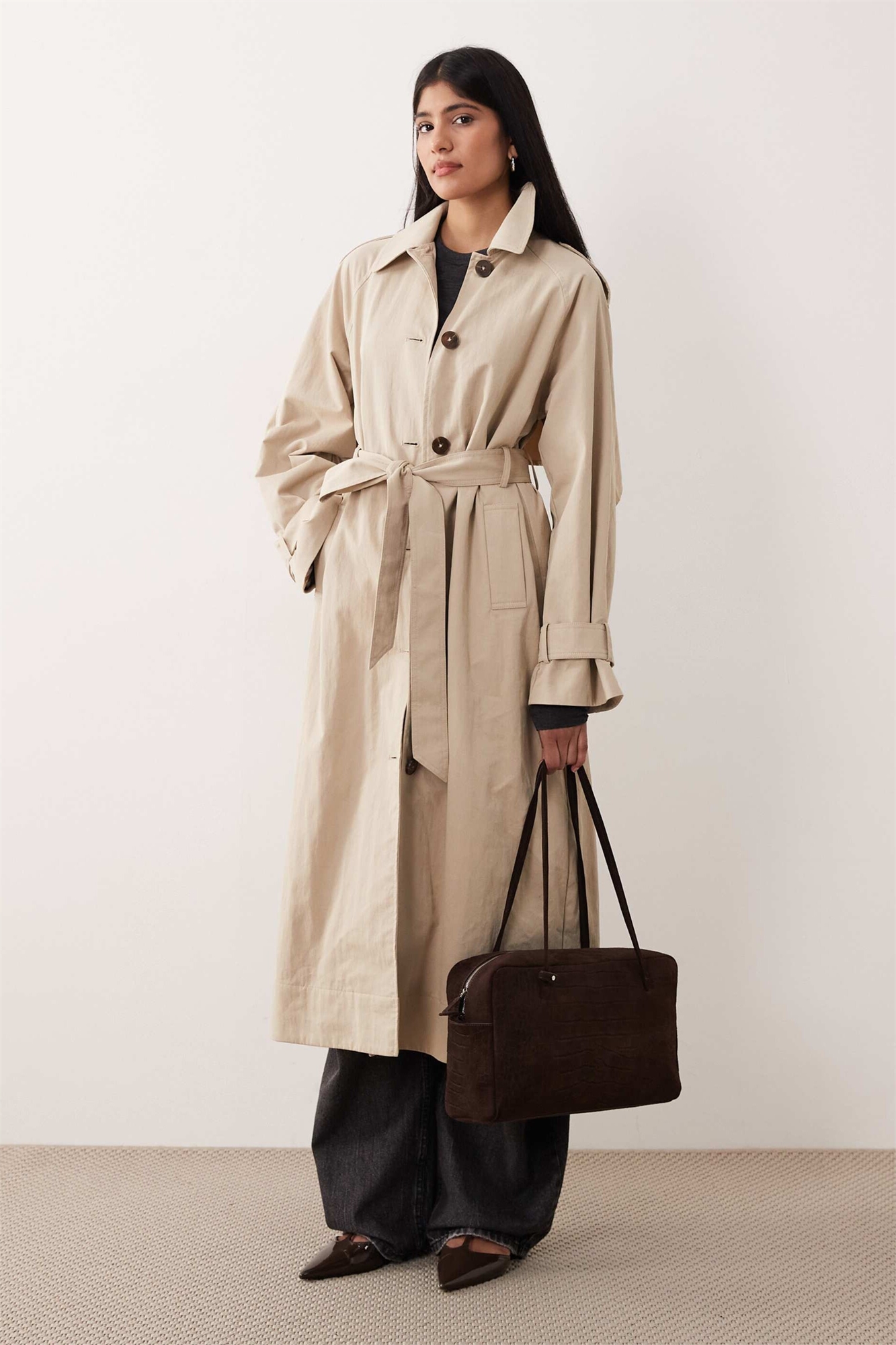 Пальто-тренч с завязывающимся поясом на спине, цвет камень