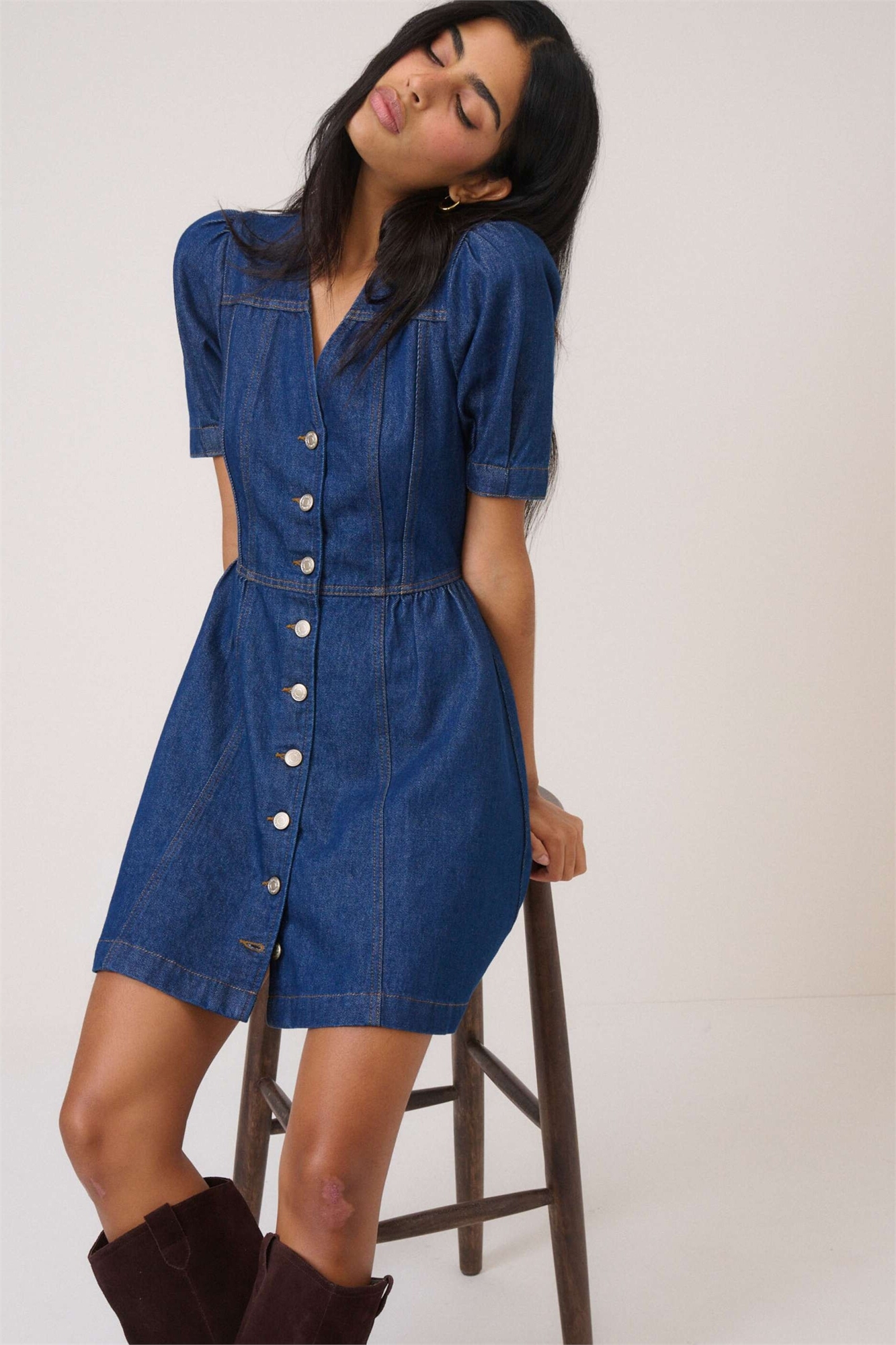 Джинсовое мини-платье с короткими рукавами и расклешенным низом синего цвета