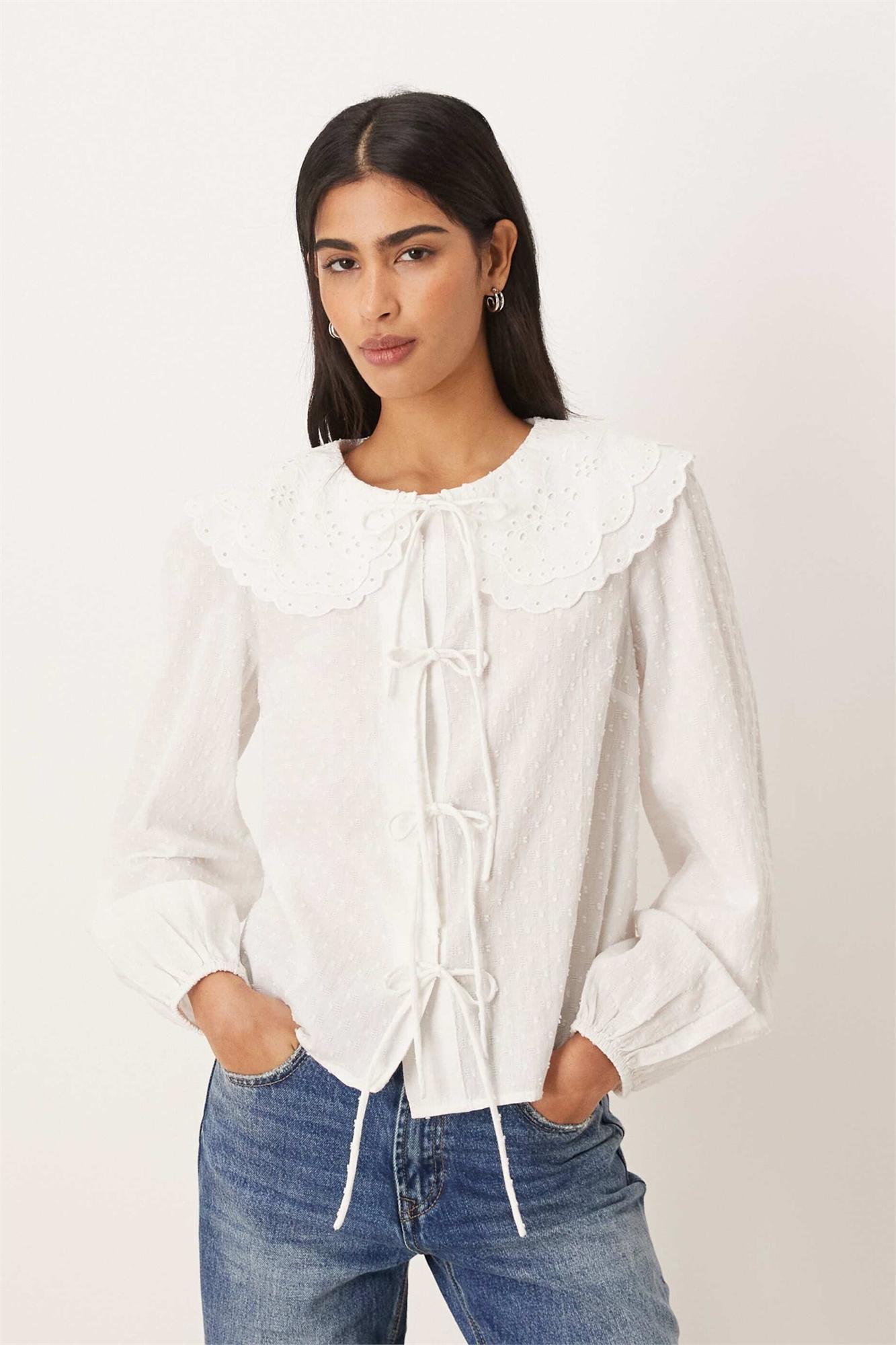 Рубашка с объемным воротником и завязками спереди, украшенная изящной вышивкой