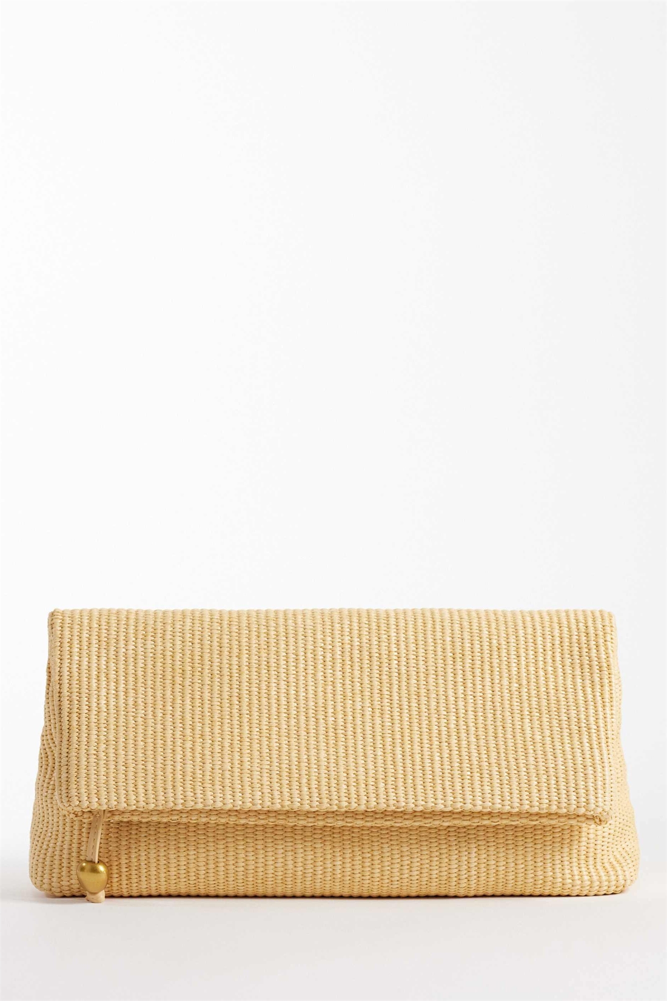 Удлиненная сумочка-клатч из соломы с металлическими элементами в виде шариков