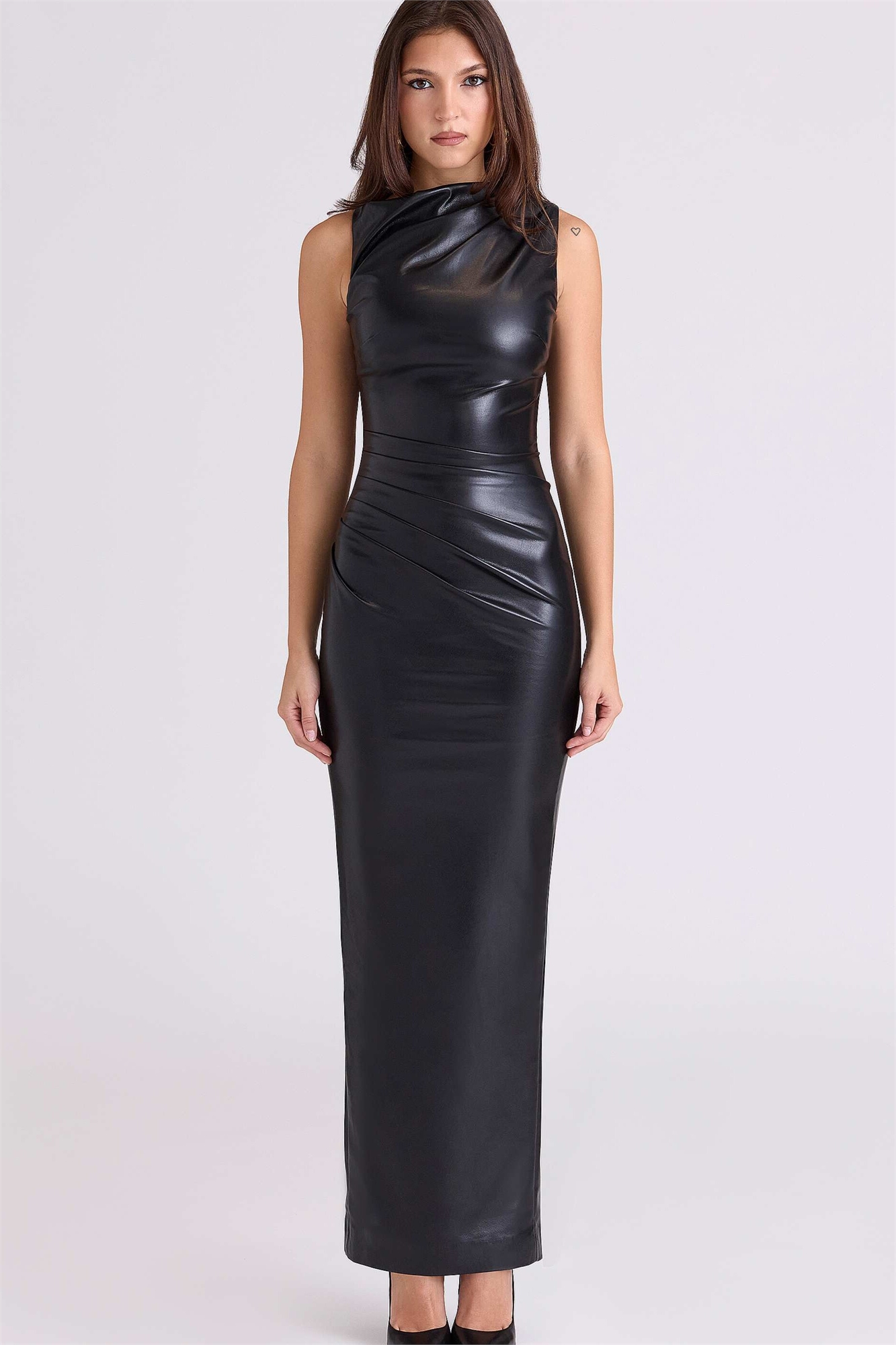 Макси-платье Maya из чёрной веганской кожи с драпировкой