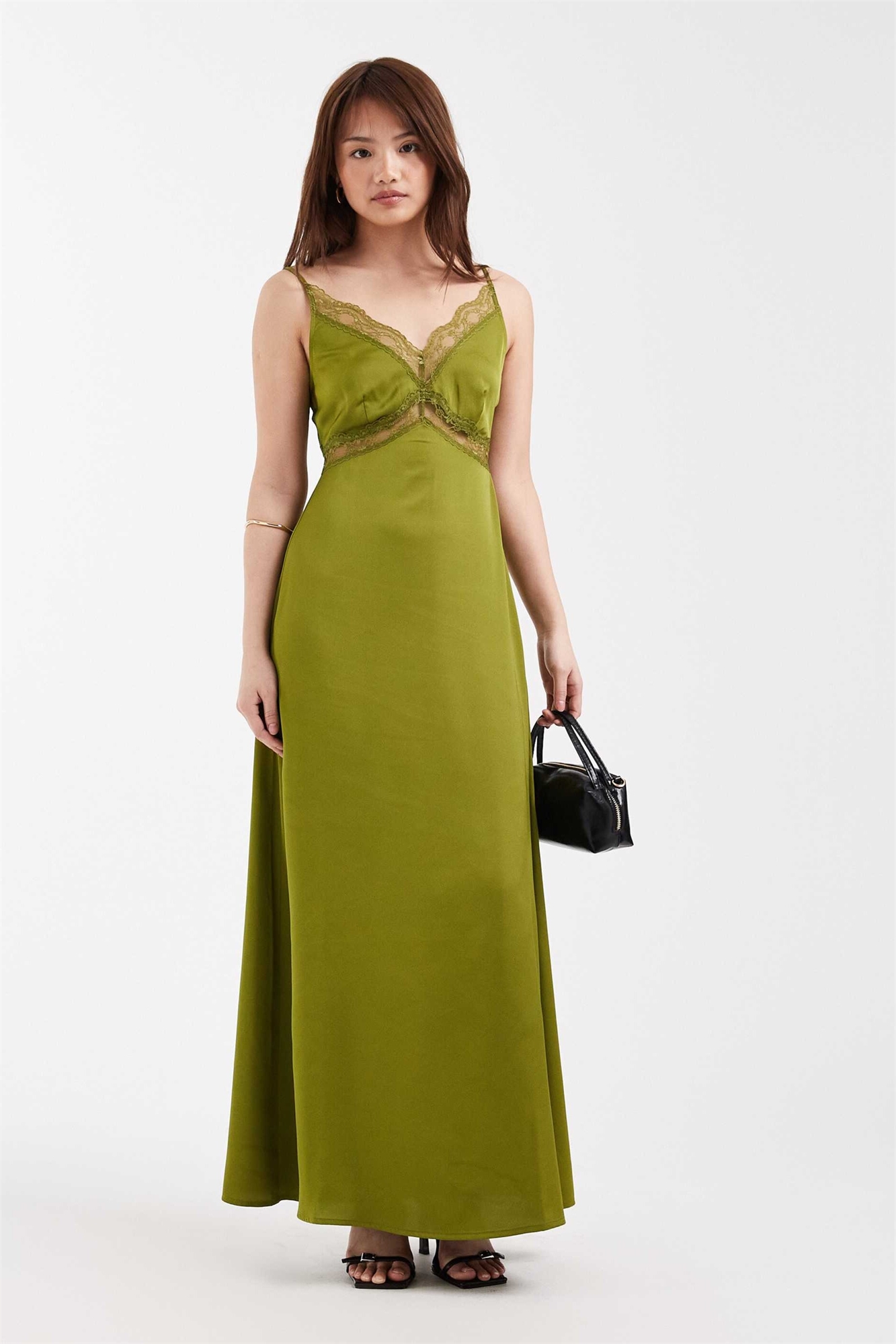 Макси-платье с атласным блеском и кружевными вставками