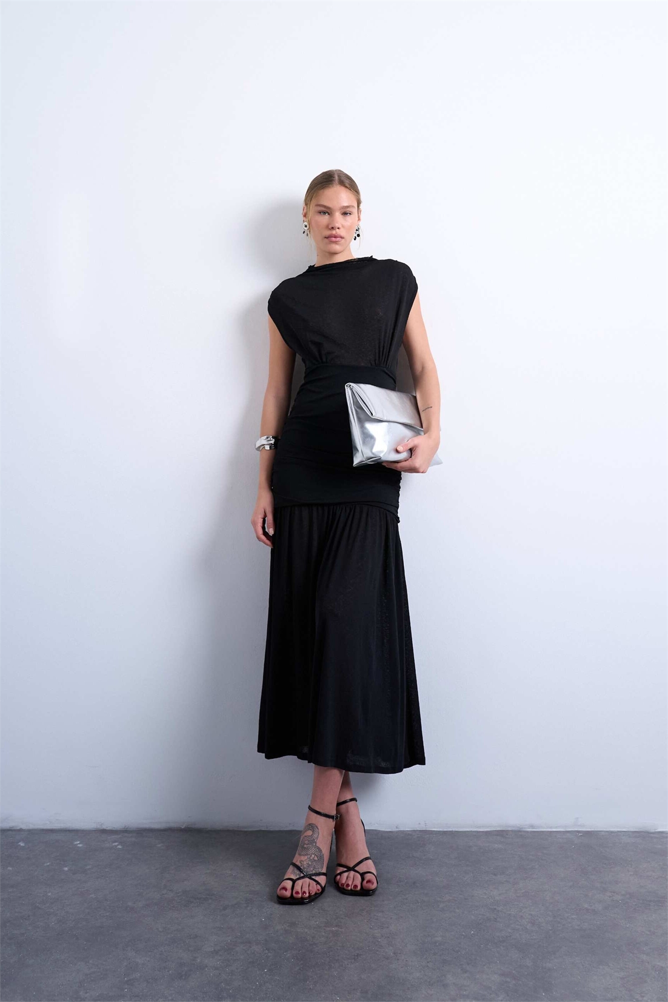 Макси-платье с высоким воротником и рюшами