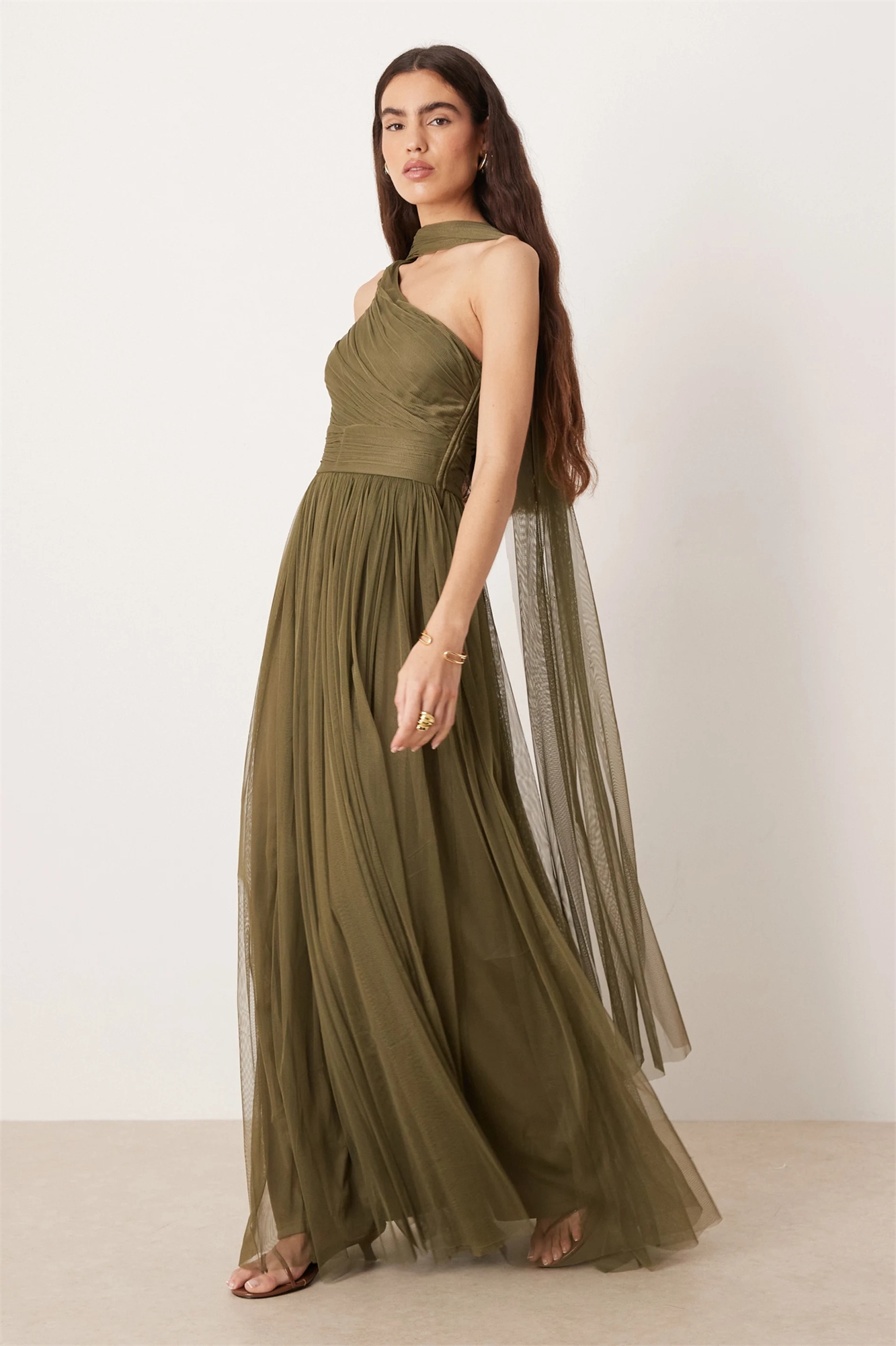 Макси-платье с одним плечом, с тюлевым шарфом на шее