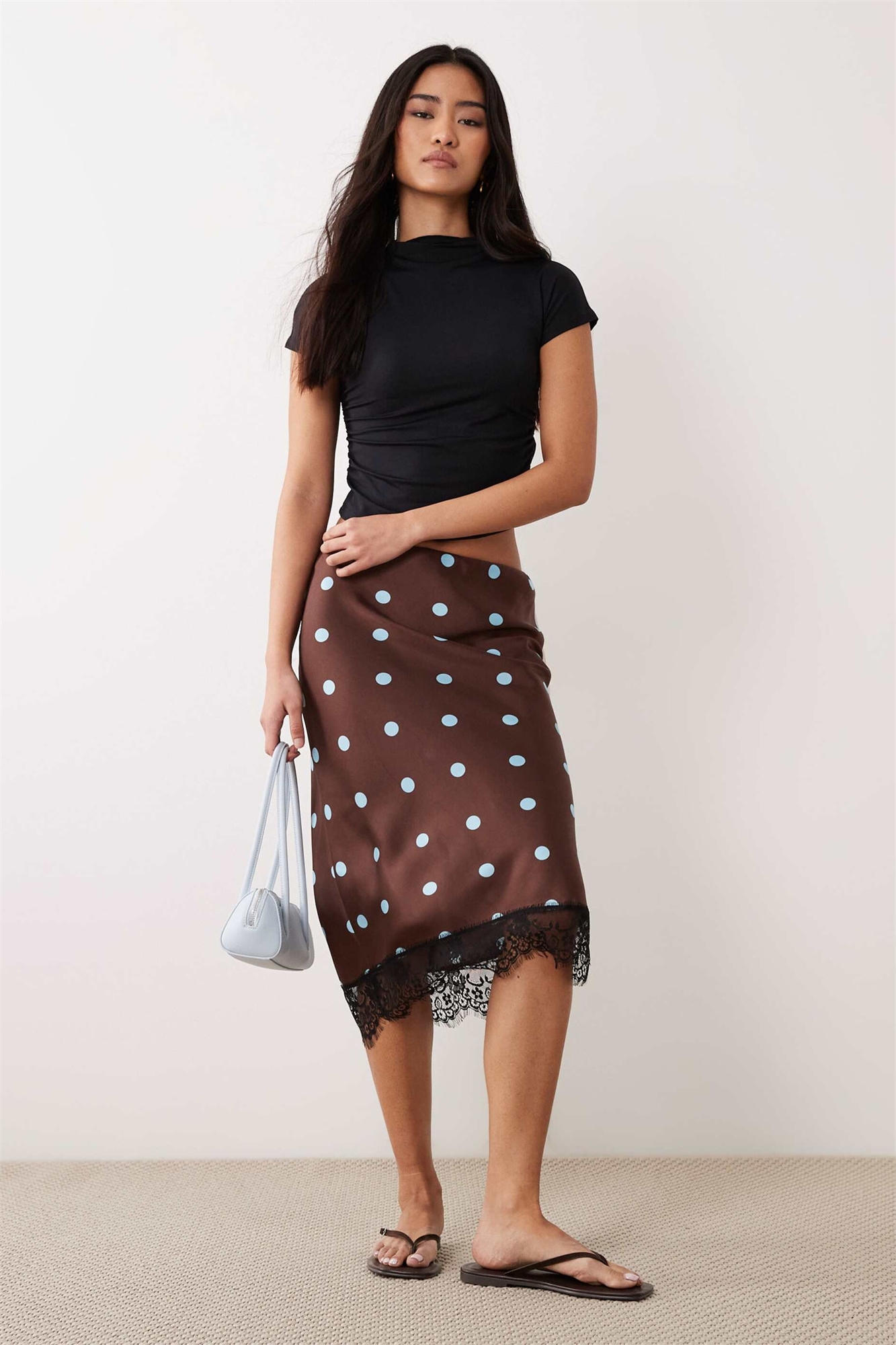 Юбка средней длины из атласа с кружевом в горошек