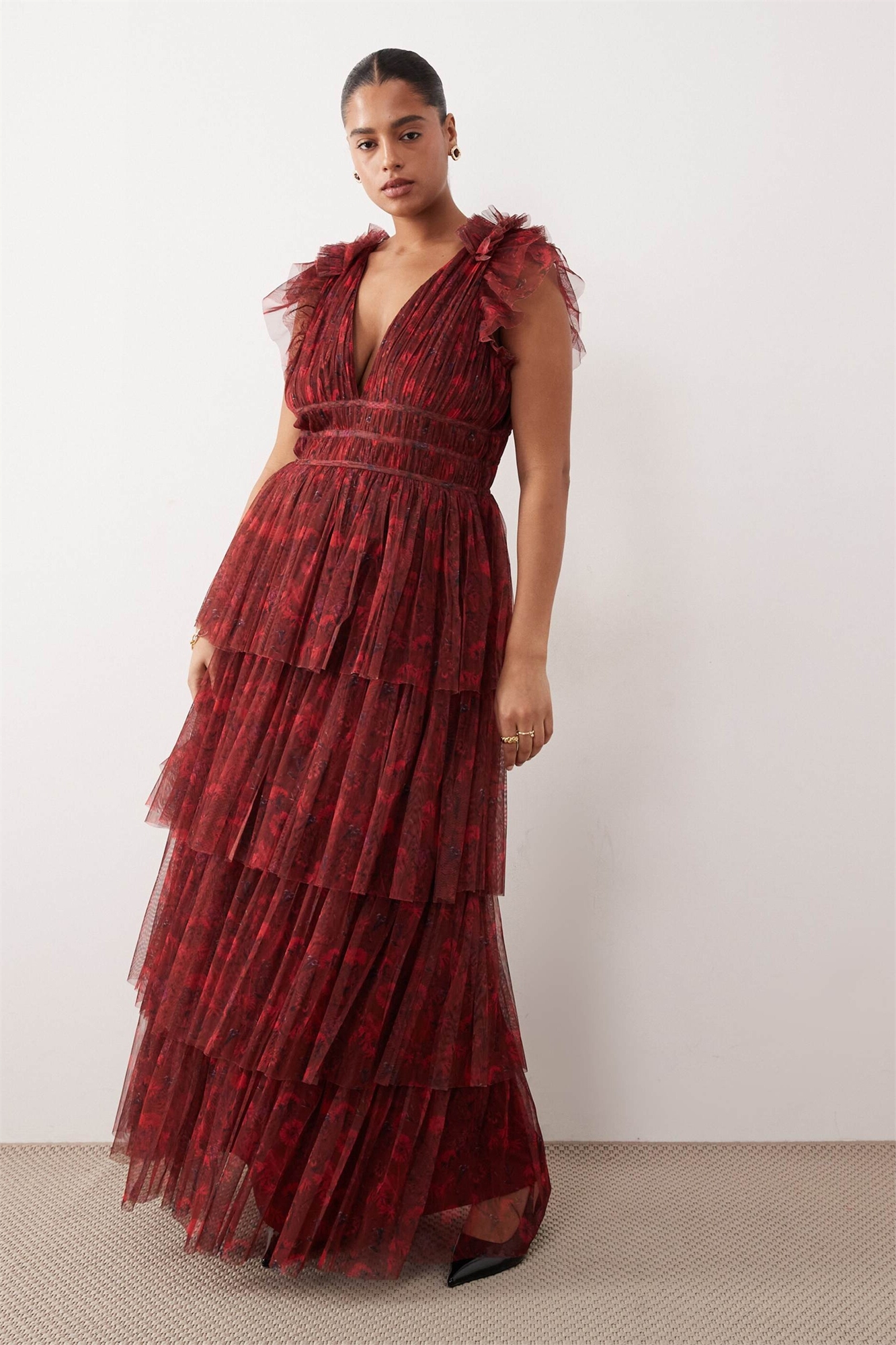 Макси-платье с тюлевыми рукавами-крылышками, глубоким вырезом и многослойным силуэтом