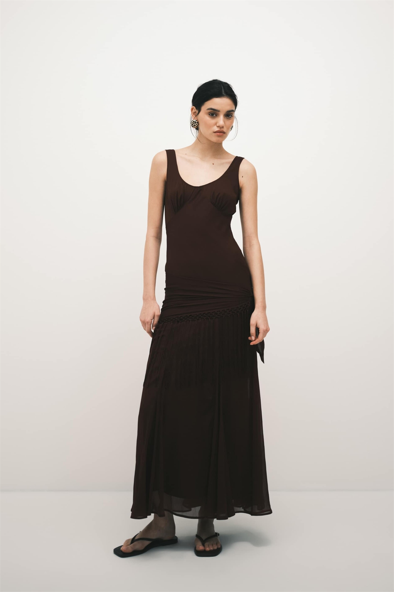Макси-платье из шифона с драпировкой и бахромой