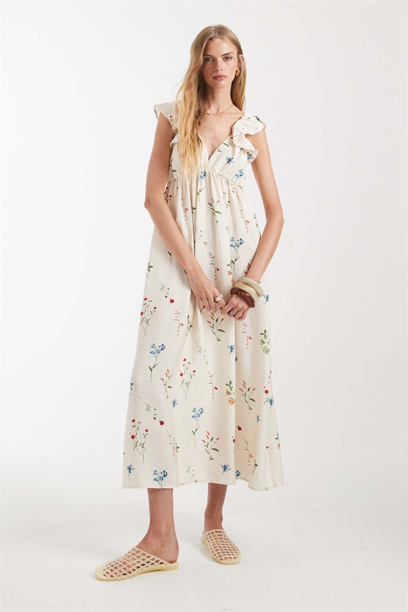 Макси-платье с воланами на плечах и V-образным вырезом
