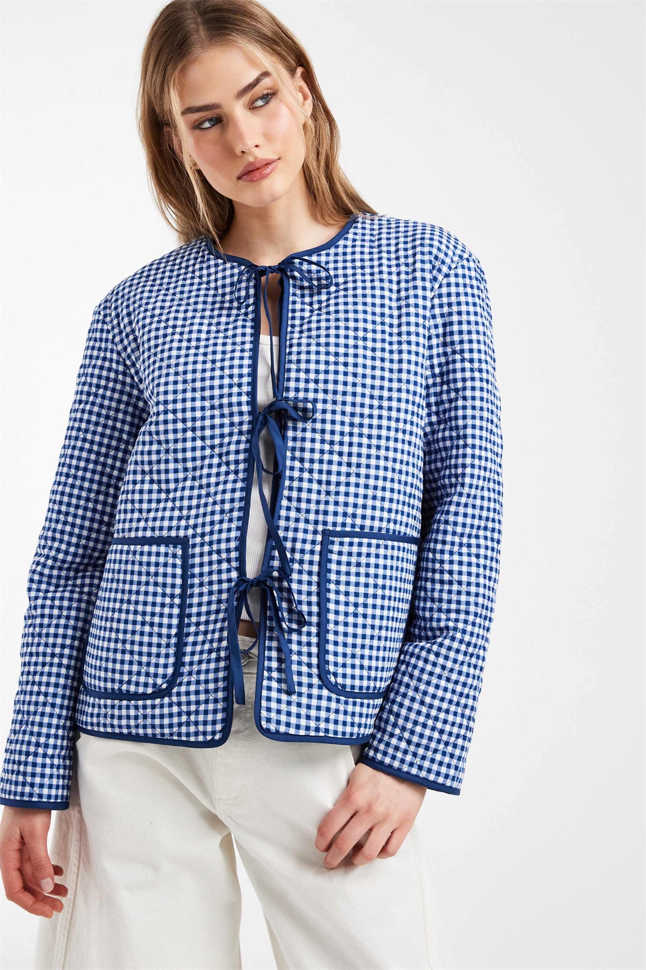 Куртка с завязками спереди, стеганая, сине-белая клетка