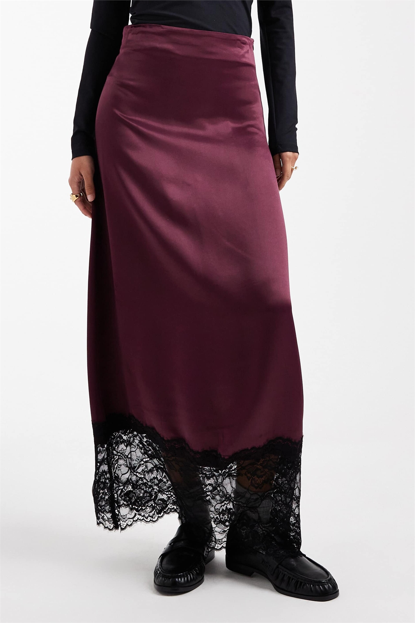 Макси-юбка из атласа и кружева с косой отрезкой