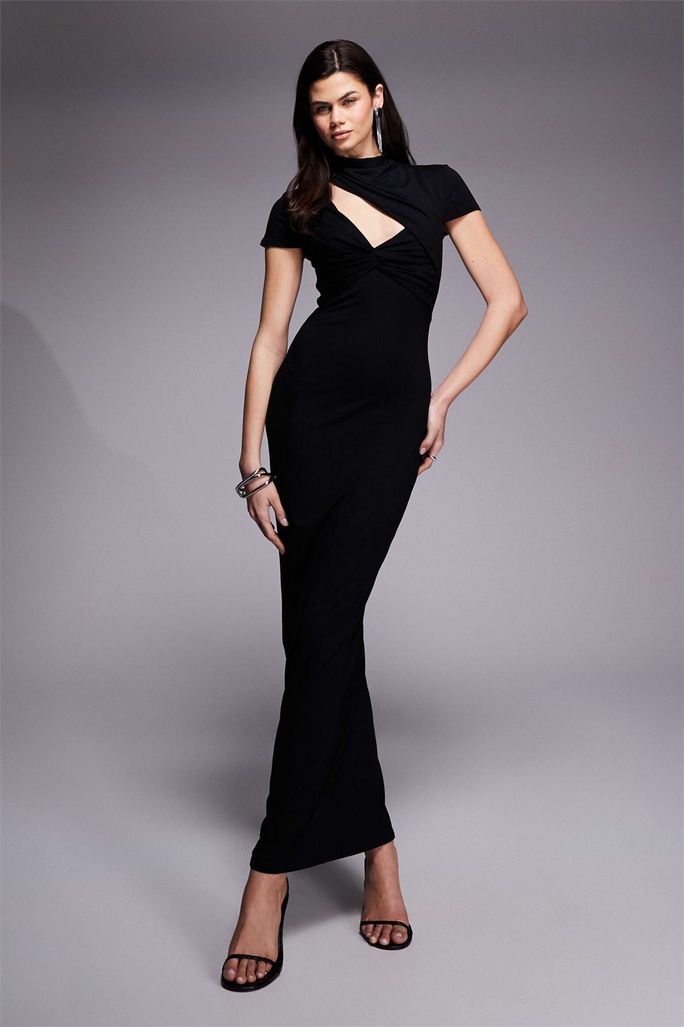Макси-платье с высоким воротником, короткими рукавами и асимметричным узлом на груди