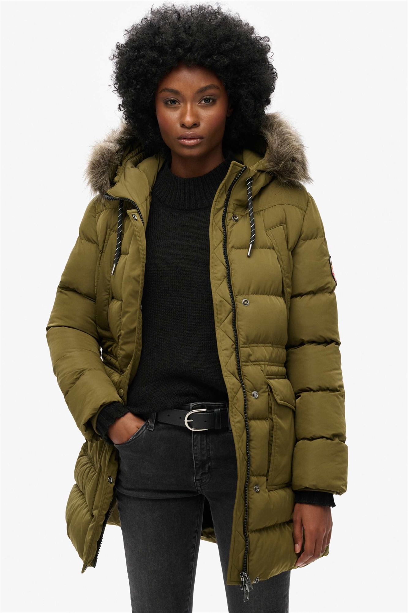 Пуховик Everest из искусственного меха средней длины темно-оливкового цвета