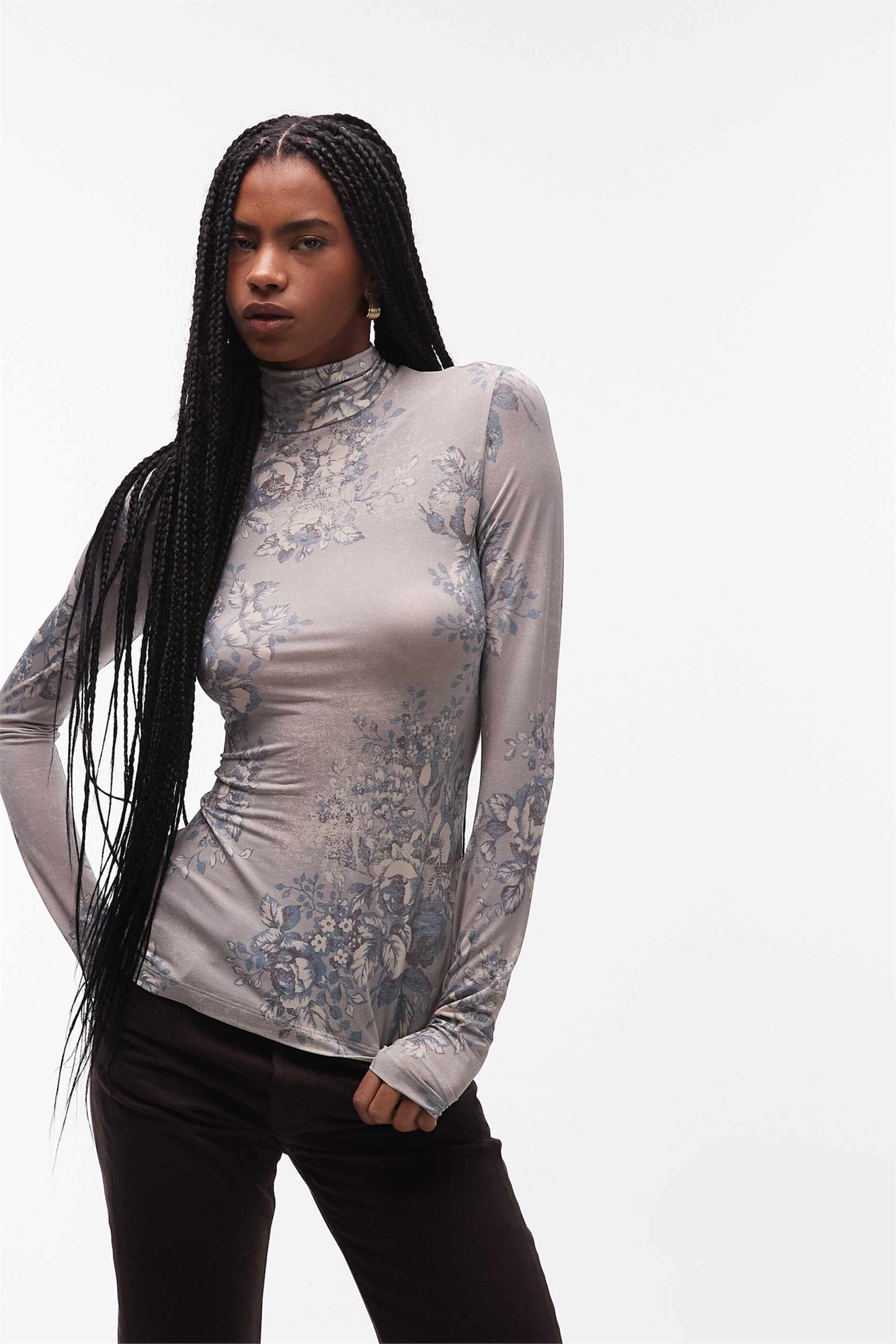 Прозрачный топ с высоким воротником и цветочным принтом