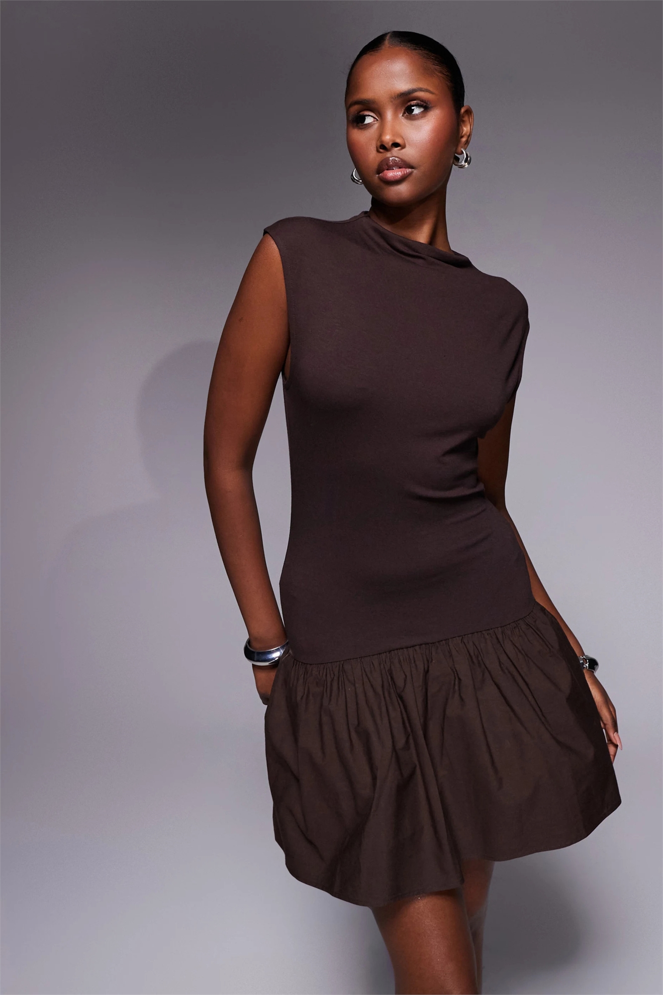 Мини-платье с вырезом на шее и юбкой из смешанной ткани с добавлением поплина