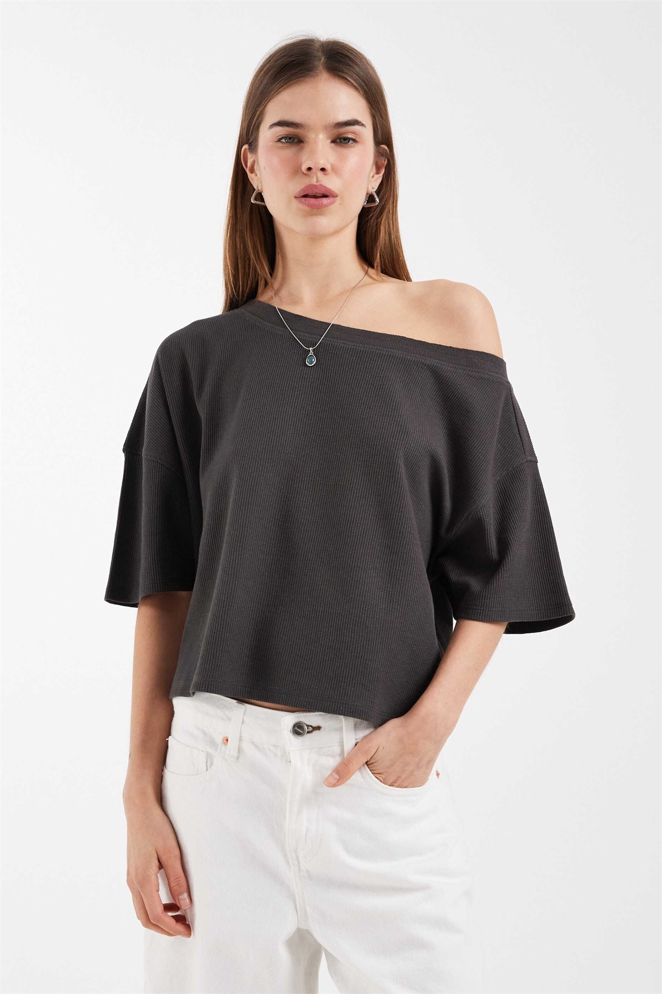 Футболка с открытыми плечами и вафельной текстурой свободного кроя