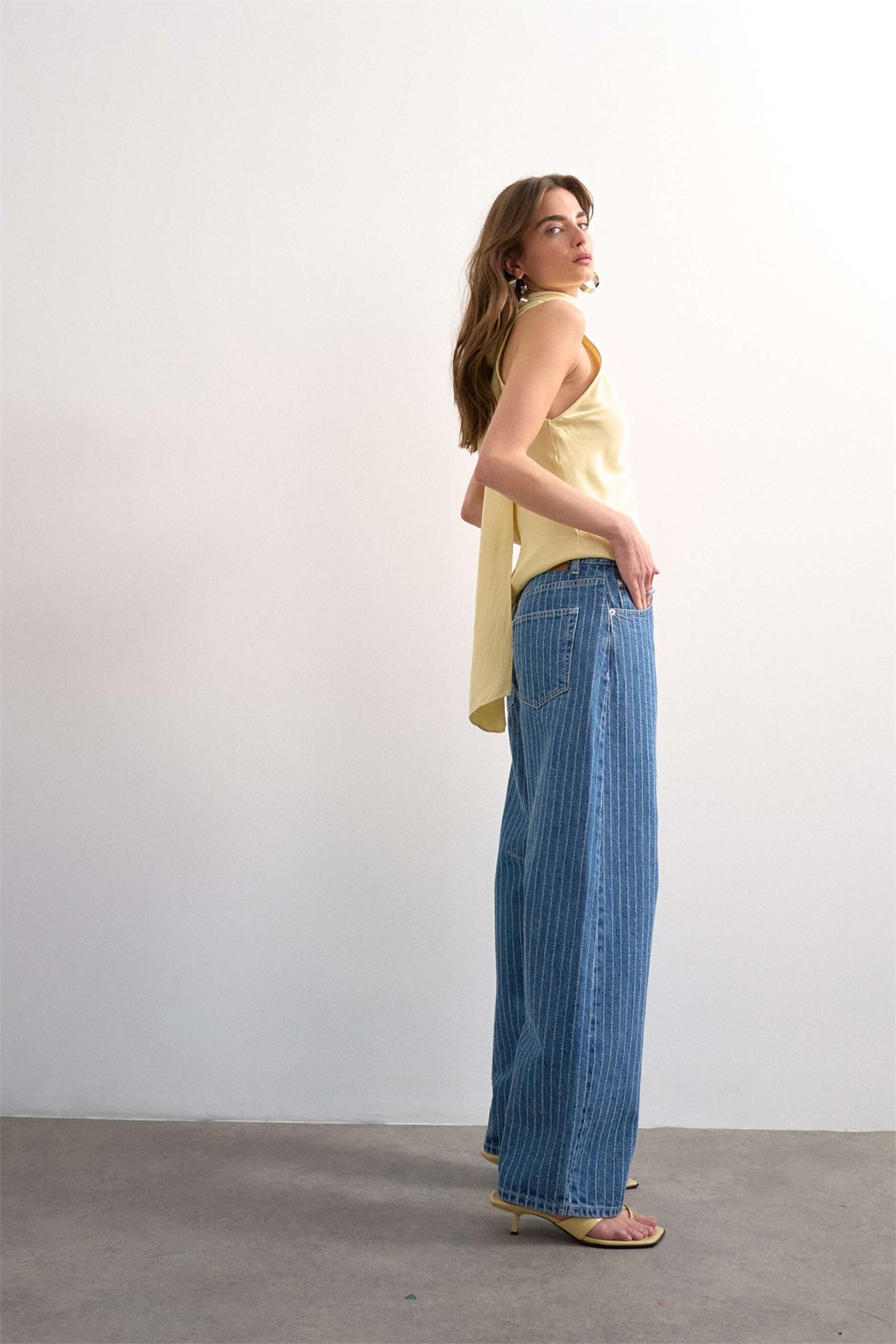 Джинсы с завышенной талией и расклешенными брючинами