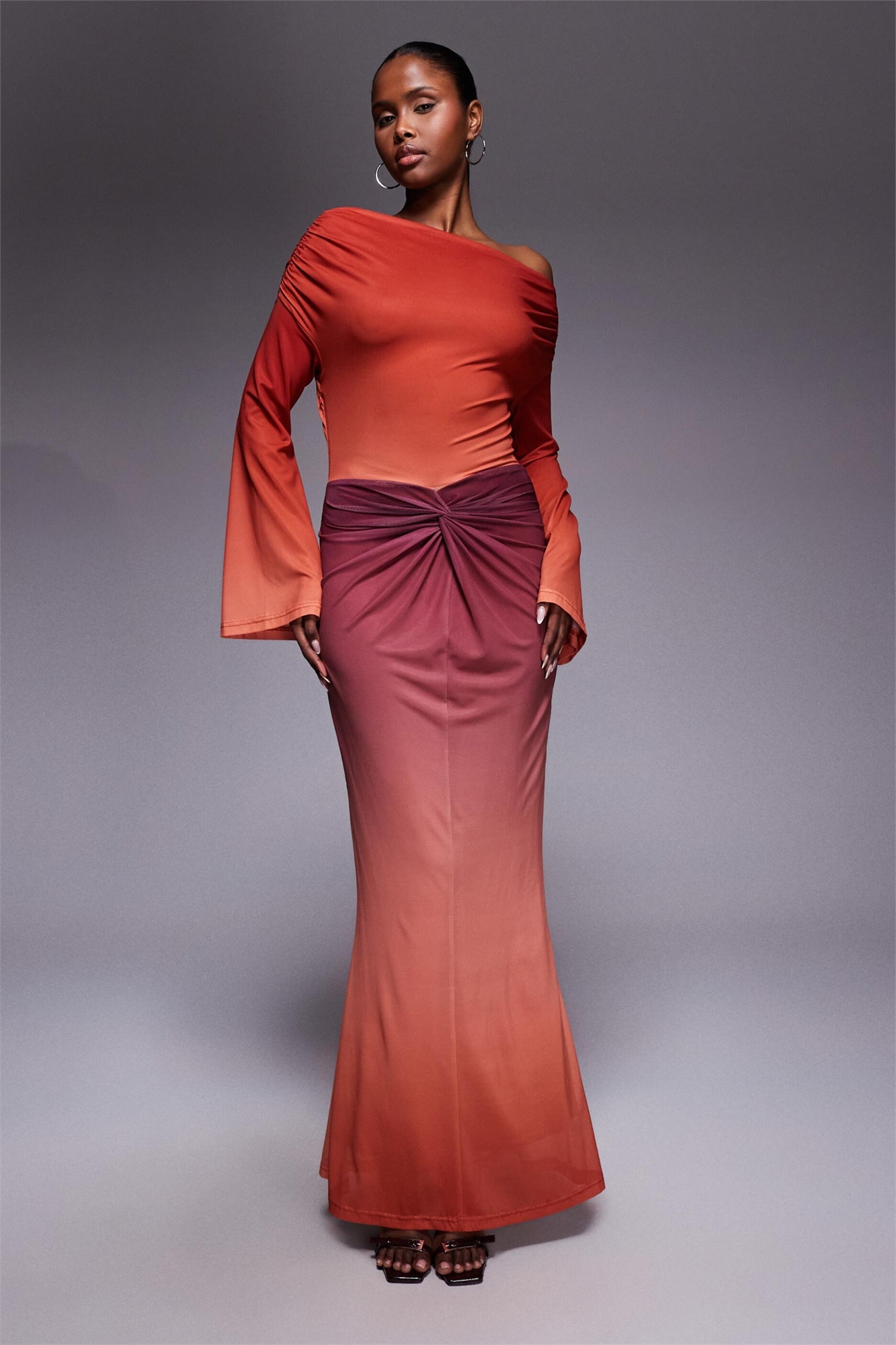 Макси-платье с скульптурной сеткой, открытыми плечами, широкими рукавами и юбкой с закрученными деталями