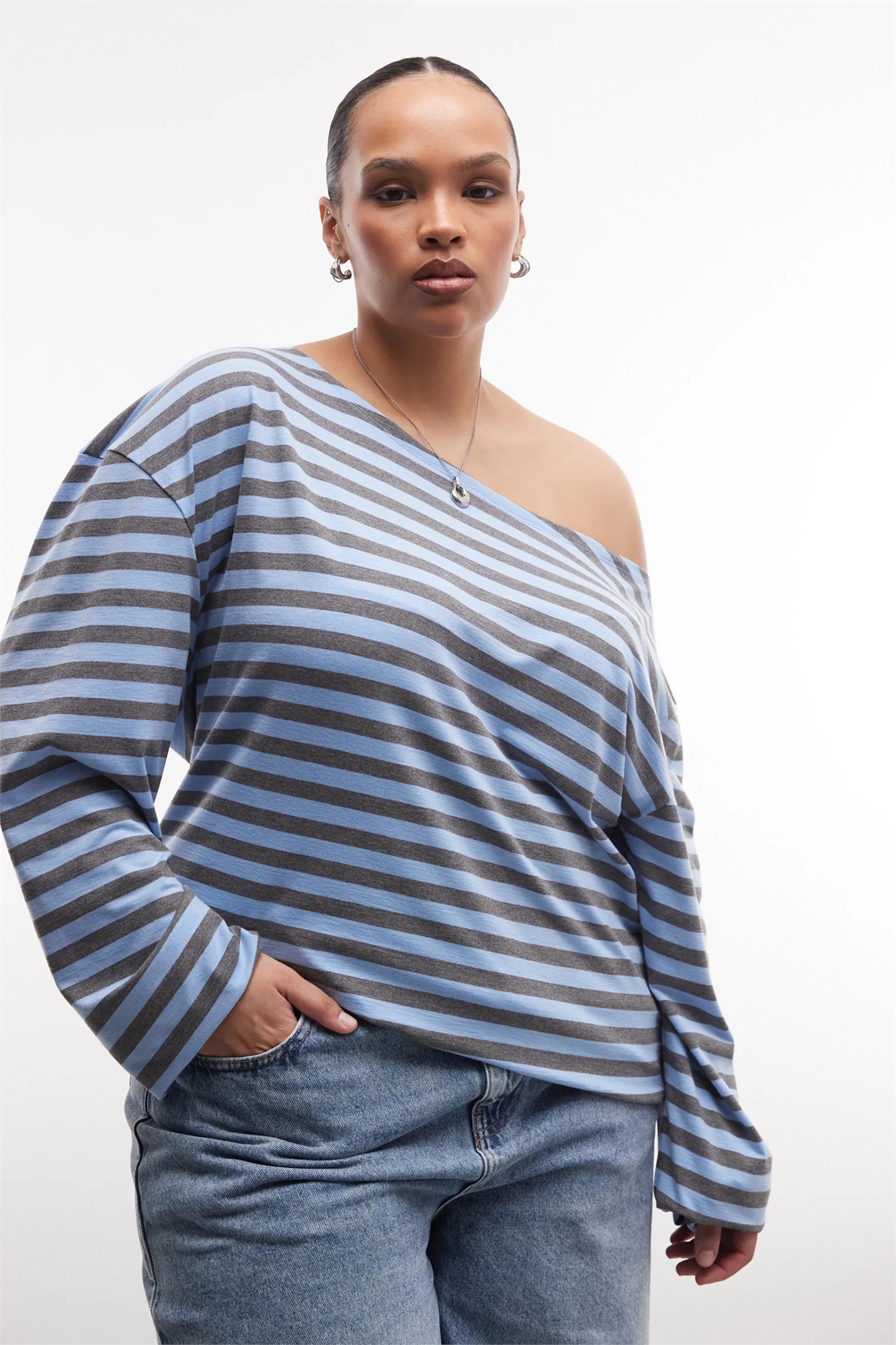 Плюс: топ с длинными рукавами и открытыми плечами в полоску