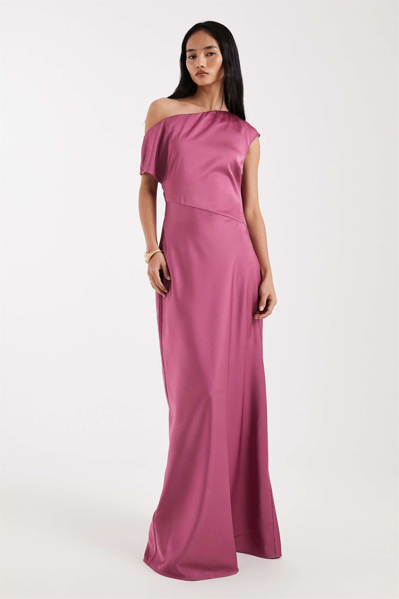 Асимметричное макси-платье из атласа с открытыми плечами для подружки невесты