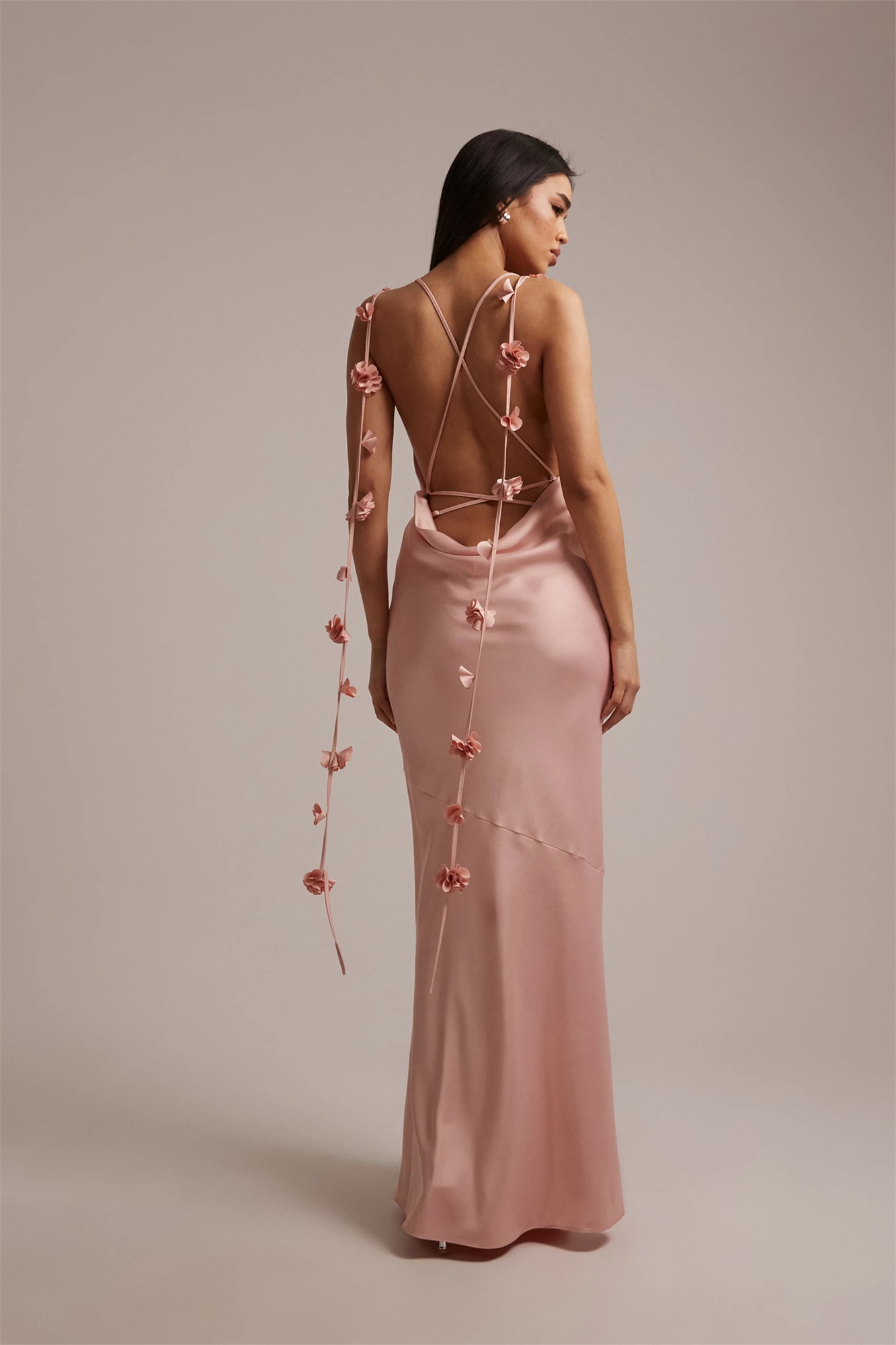 Макси-платье из атласа «Ария» с капюшоном, драпировкой, бантиком и перекрещивающейся спинкой