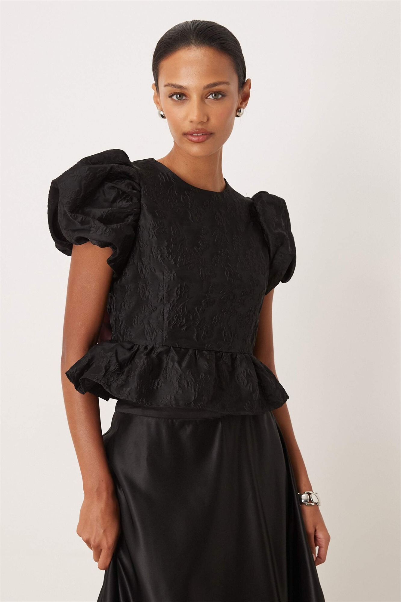 Топ с жакардовым принтом, буффами, оборками по низу, открытой спинкой и контрастным бантом