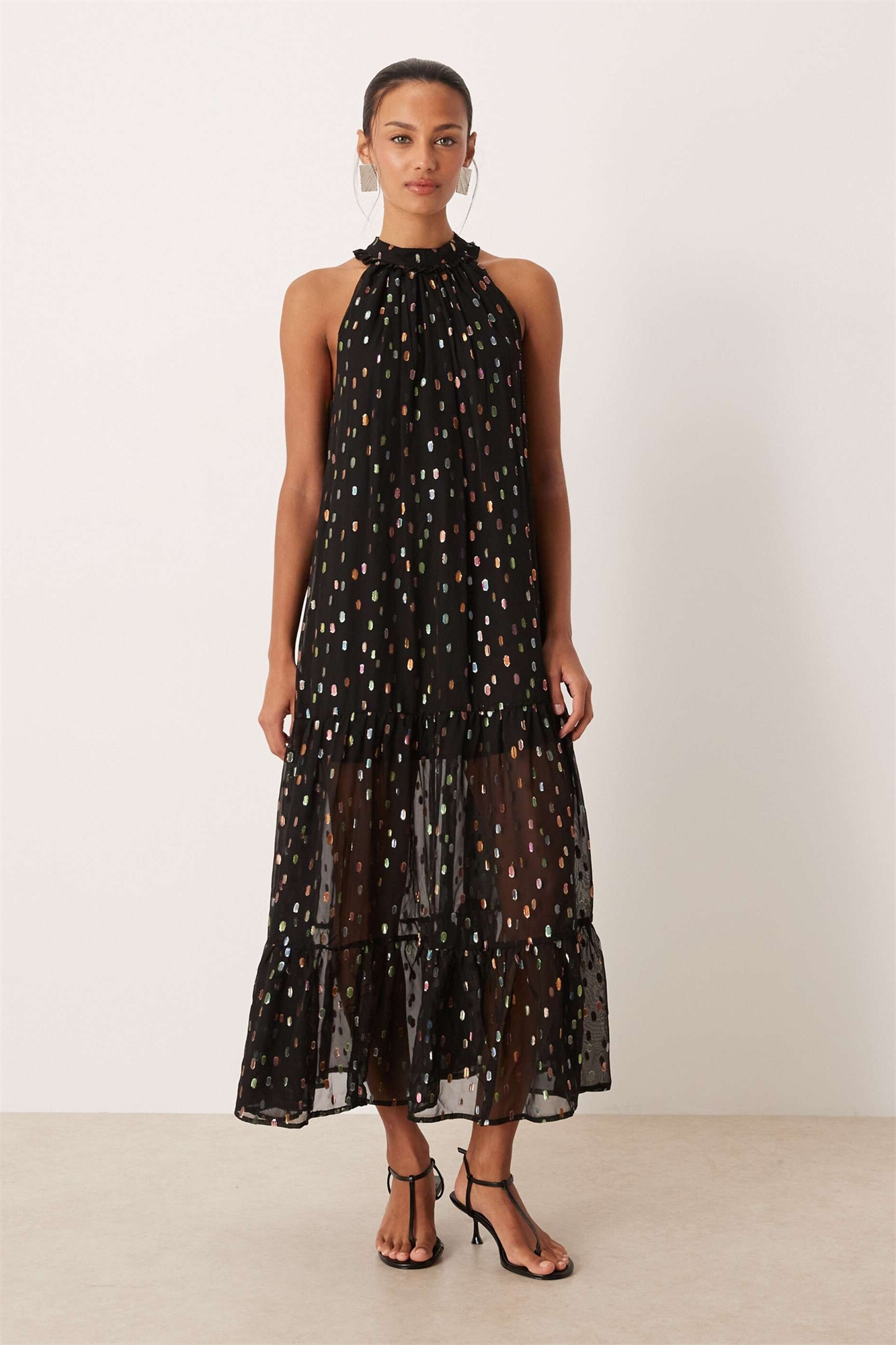 Макси-платье из шифона «Odyssey» с металлическим принтом в виде кружочков, высоким воротником и прозрачной юбкой