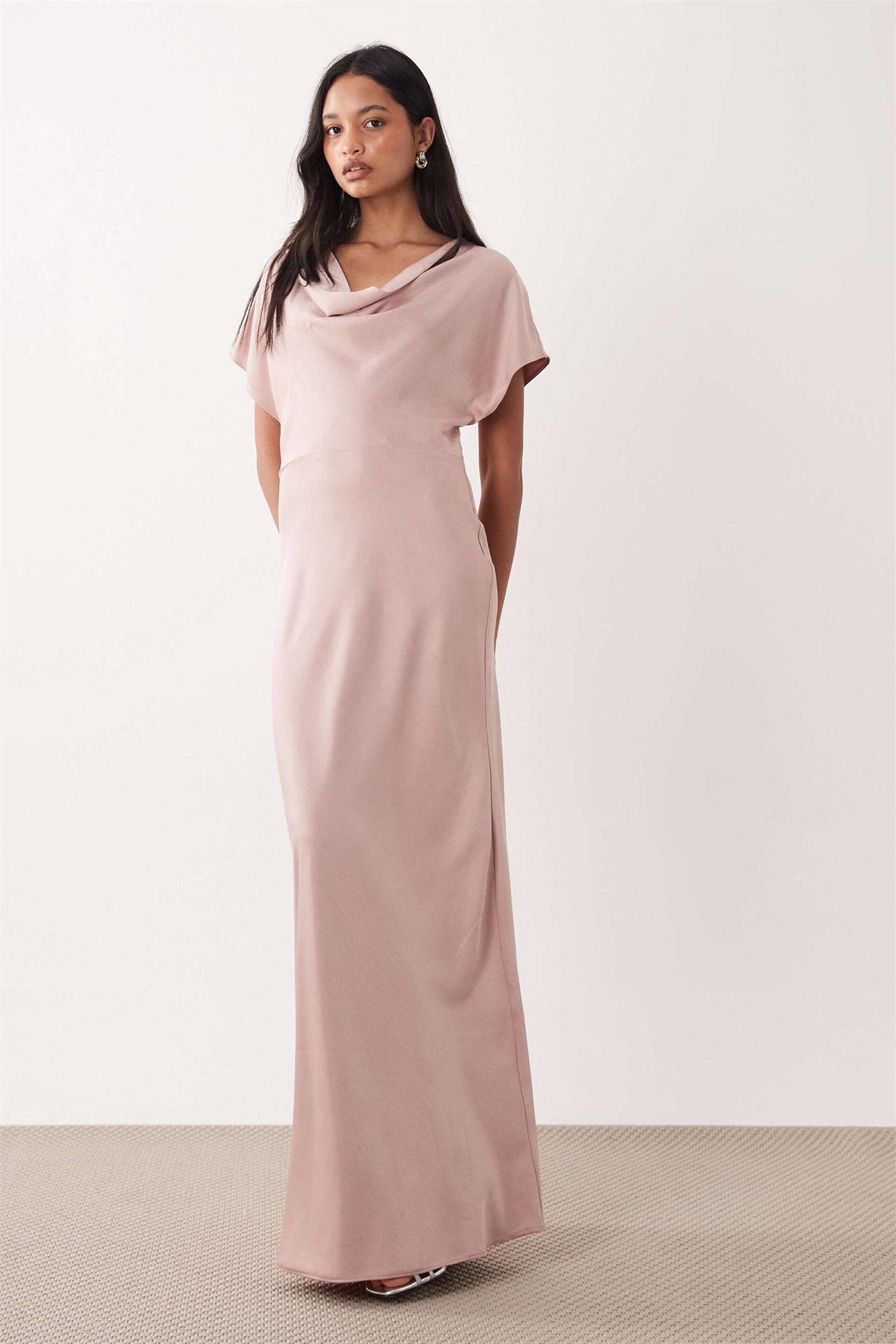 Атласное макси-платье с заниженными плечами и косой отрезкой для подружки невесты