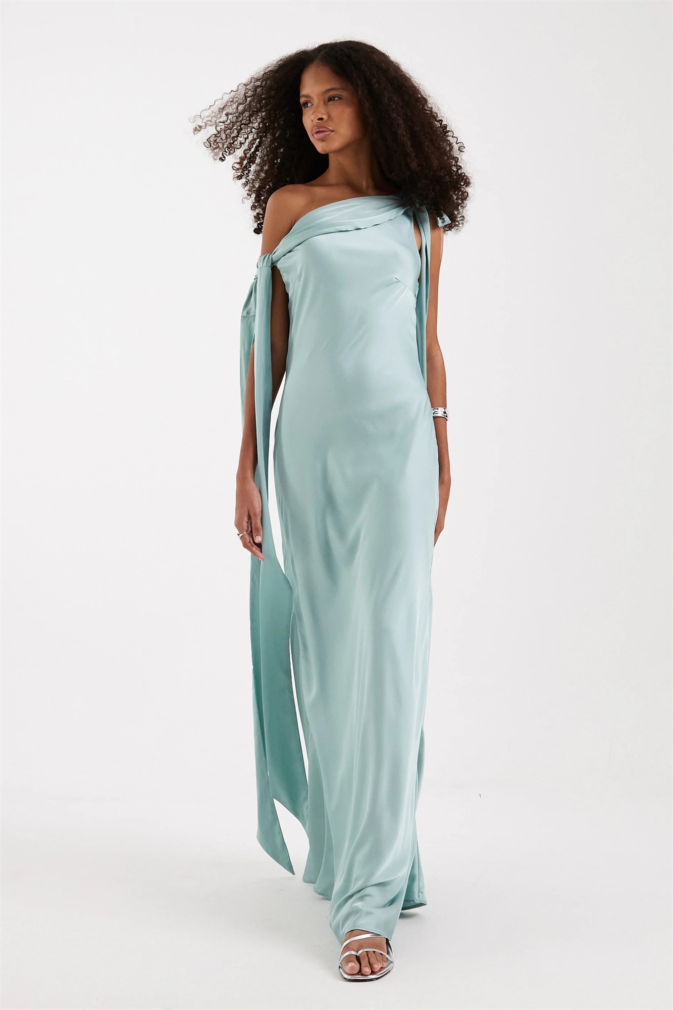 Атласное макси-платье с открытыми плечами для подружек невесты