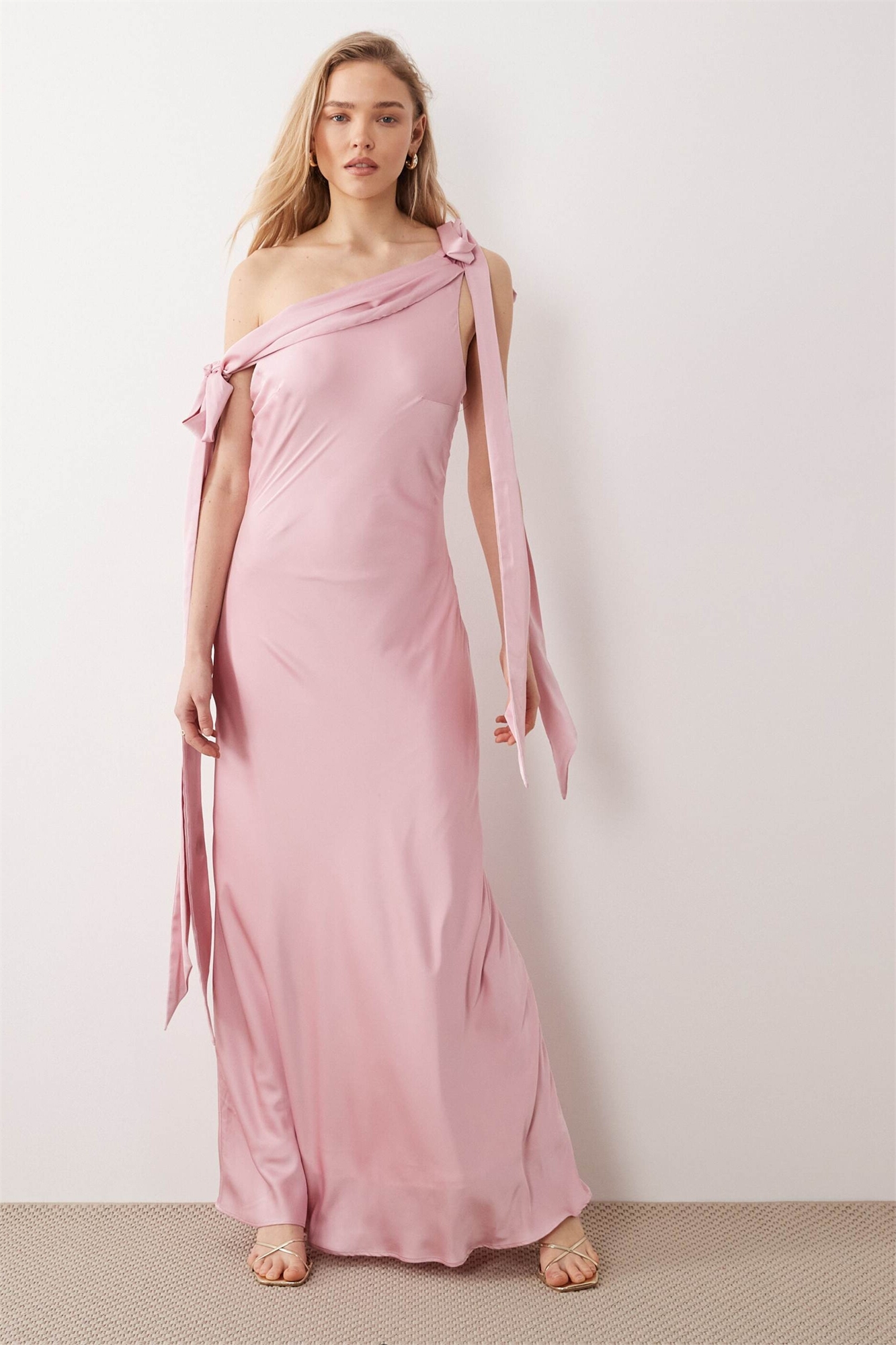 Атласное макси-платье с открытыми плечами для подружек невесты