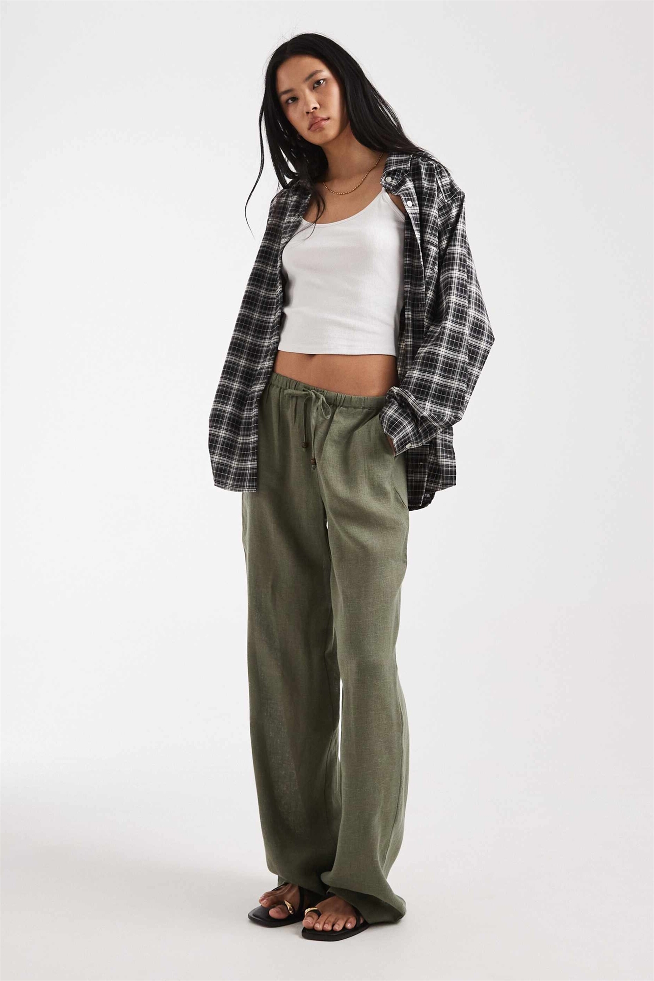 Штаны с широкими брючинами из смешанного льна светло-хаки