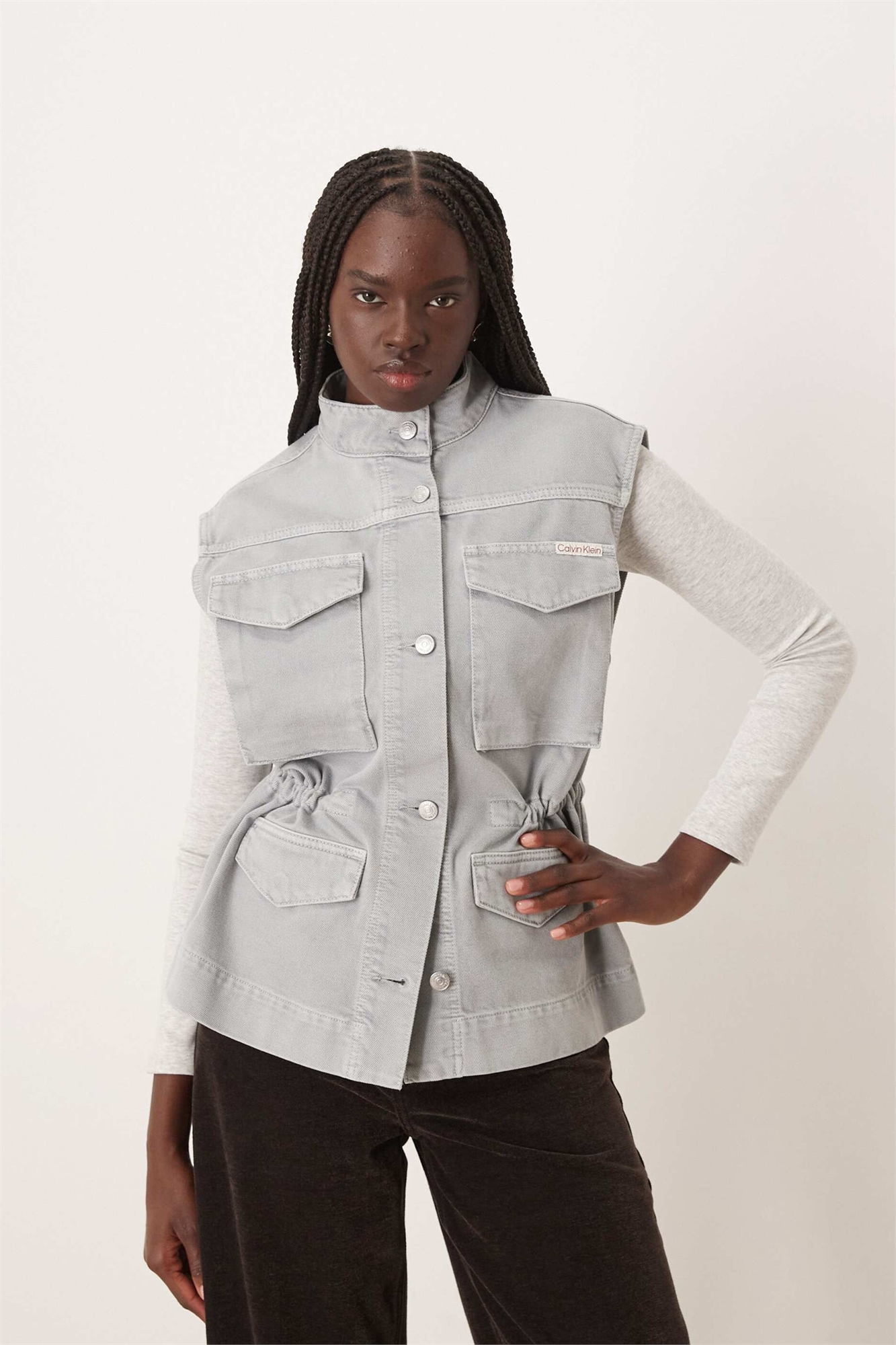Неэластичный деним: серый цвет Основной материал: 59% хлопок, 41% лиоцелл.