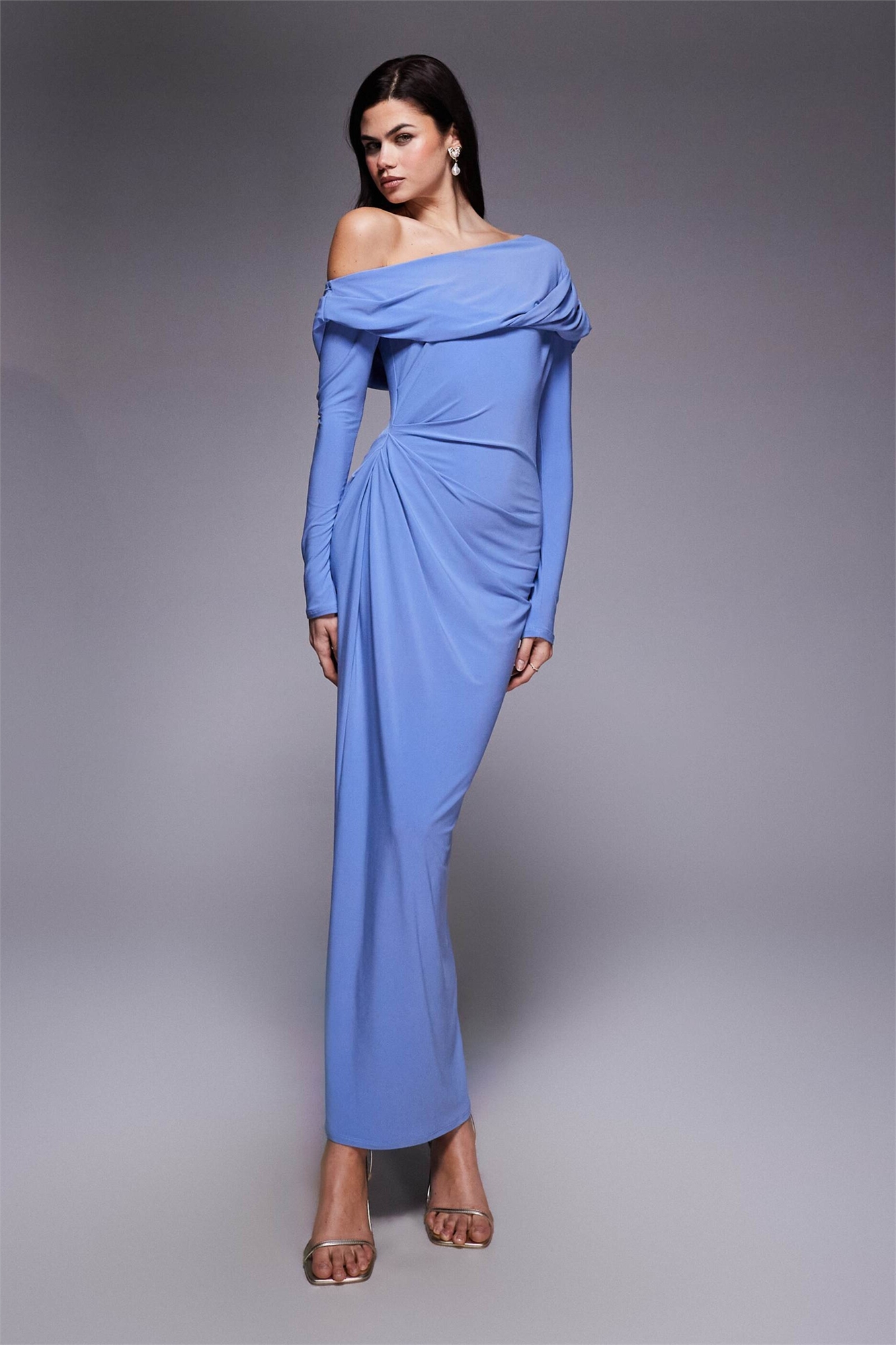 Облегающее макси-платье с длинными рукавами, спущенными плечами и драпировкой