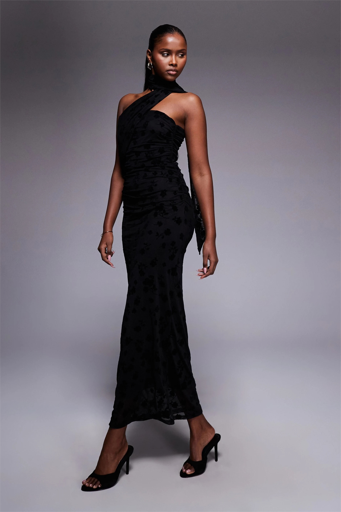 Макси-платье-бандо с цветочным флокированным узором на сетчатом шарфе
