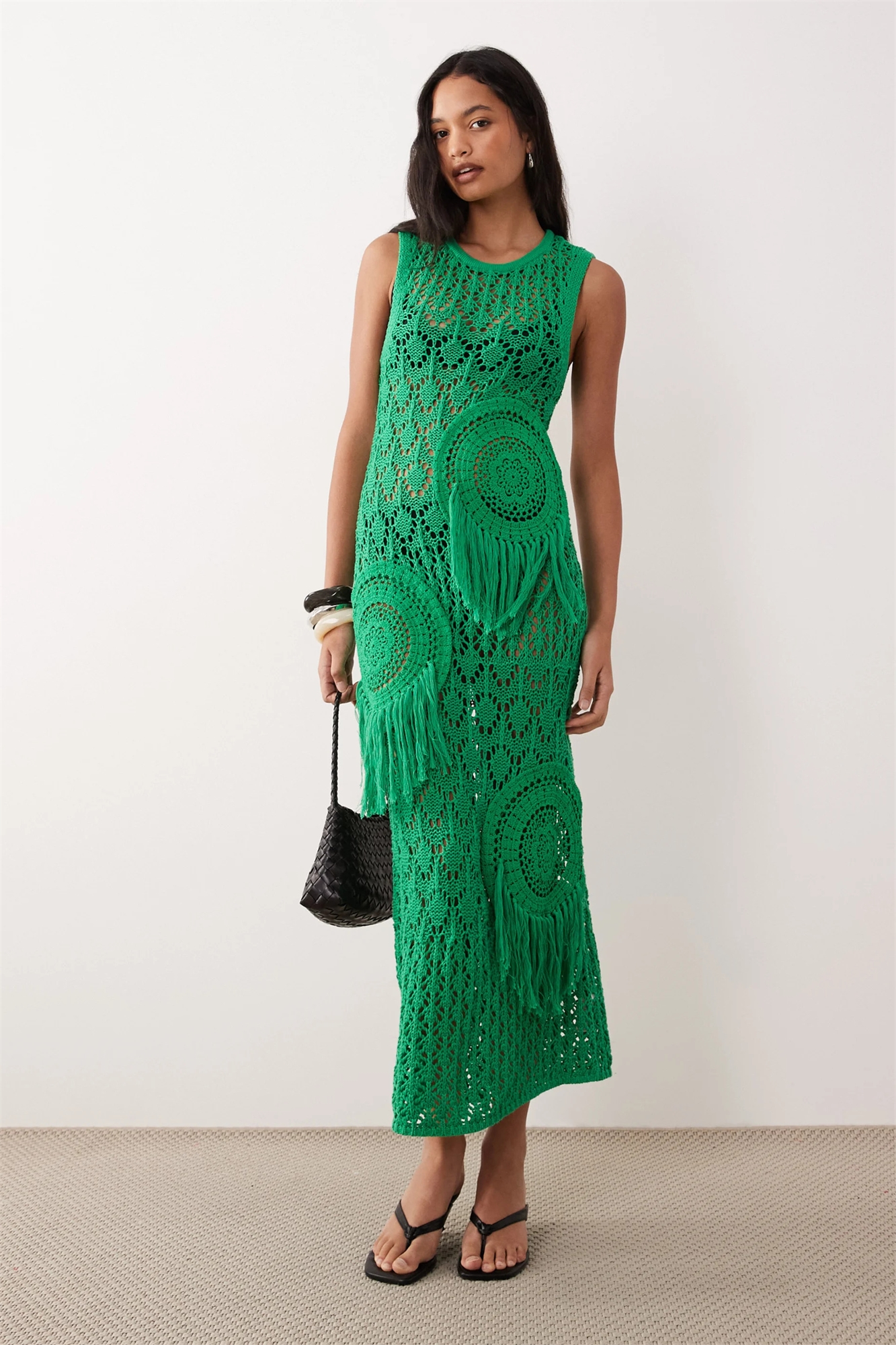 Макси-платье из вязаного крючком пэчворка с открытой вязкой и бахромой