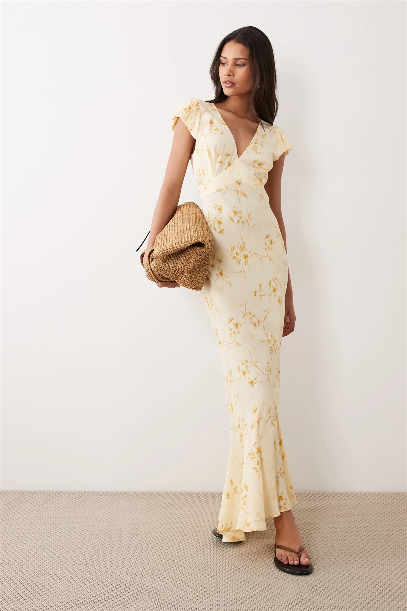 Макси-платье с рукавами-буф и V-образным вырезом, желтое, с цветочным принтом
