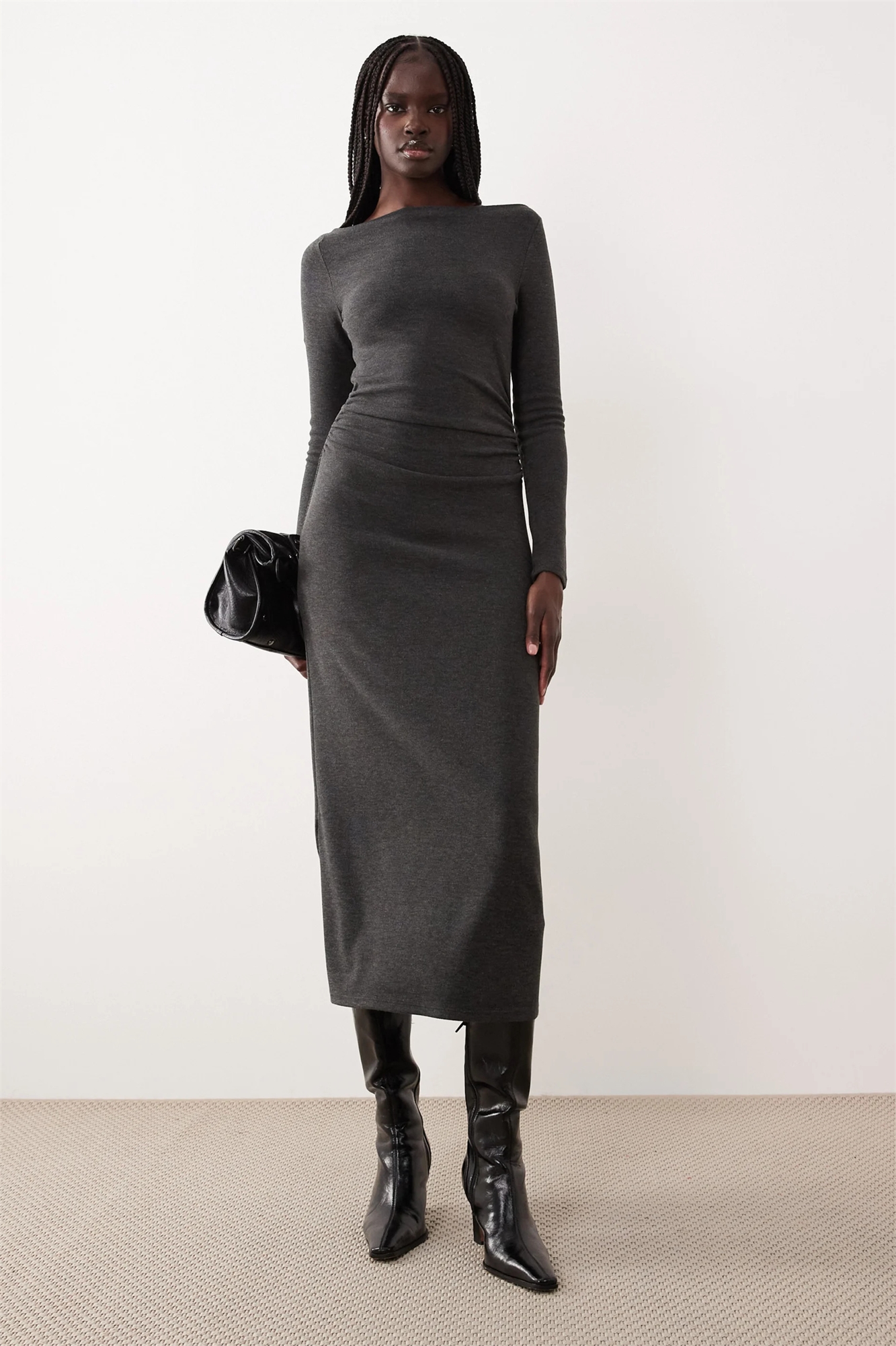 Макси-платье с лодочным вырезом, сборками на талии и длинными рукавами