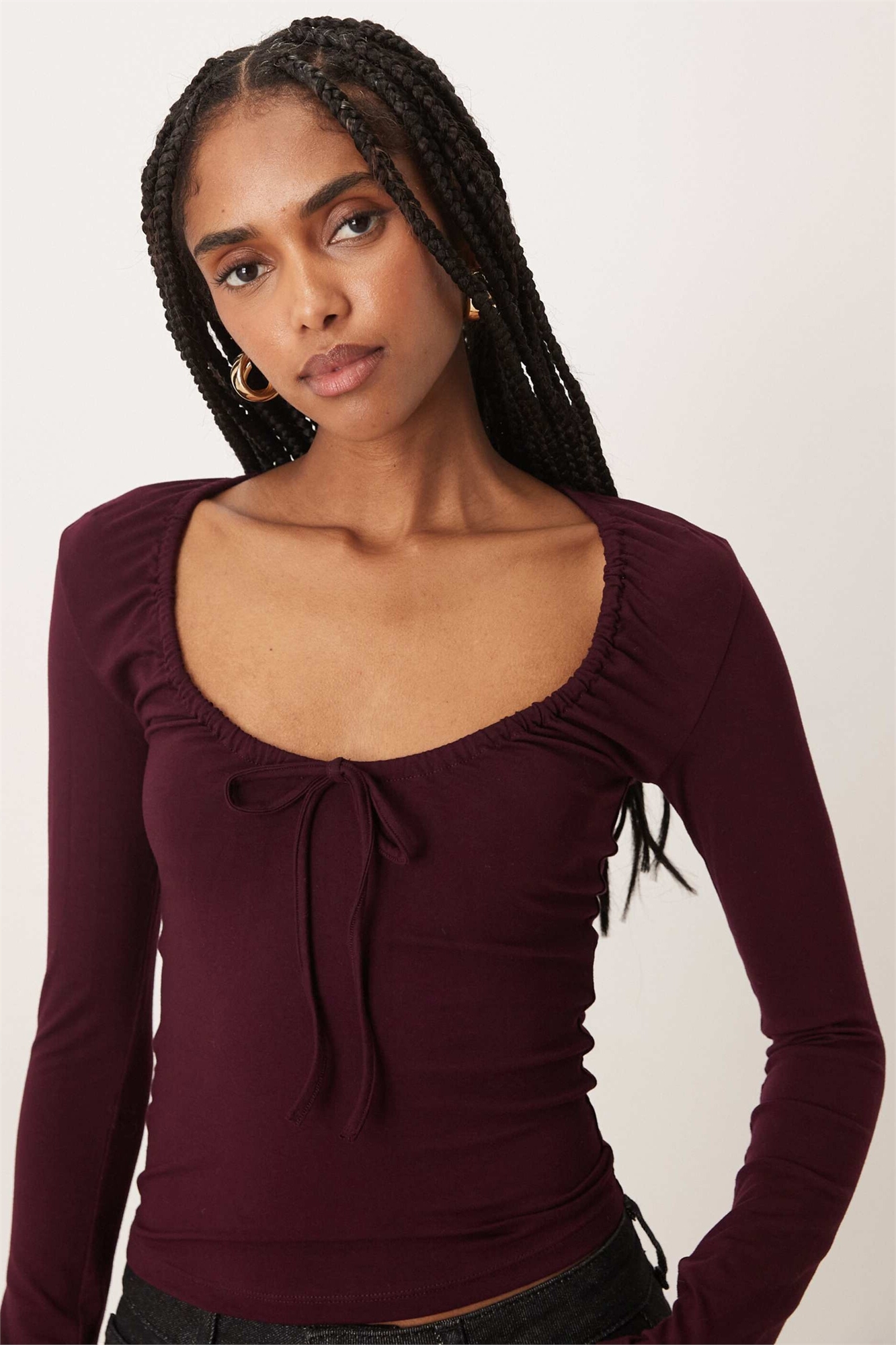 Топ с рюшами, глубоким вырезом и длинными рукавами