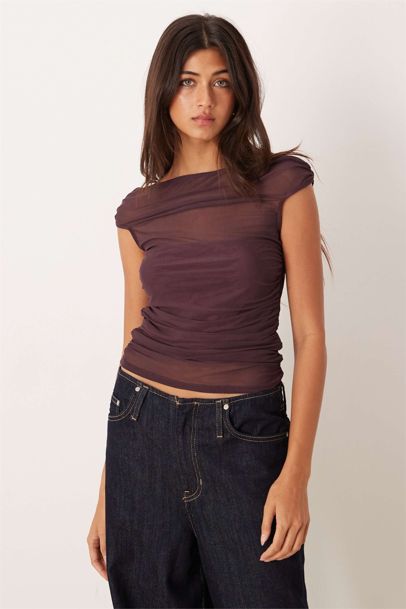 Топ из сетчатой ткани с открытыми плечами и короткими рукавами