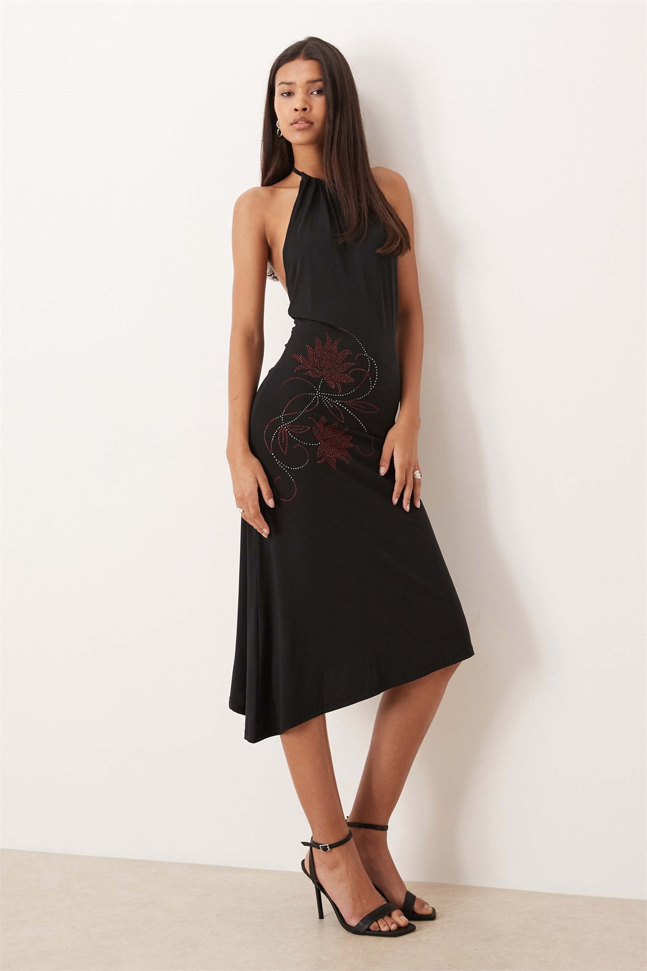 Асимметричное платье-халтер от Zavine с украшением из страз в виде цветка