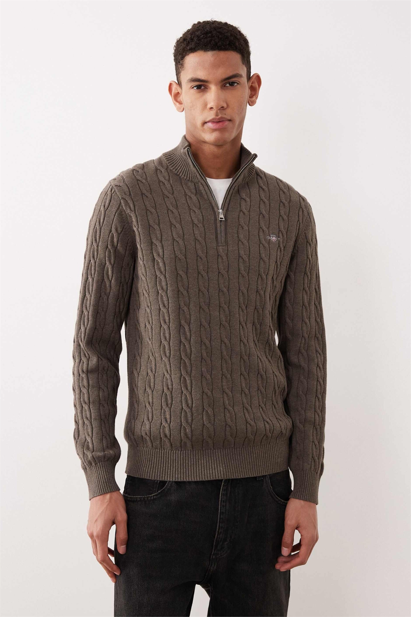 Свитер из хлопка с косой вязкой и полузастежкой-молнией