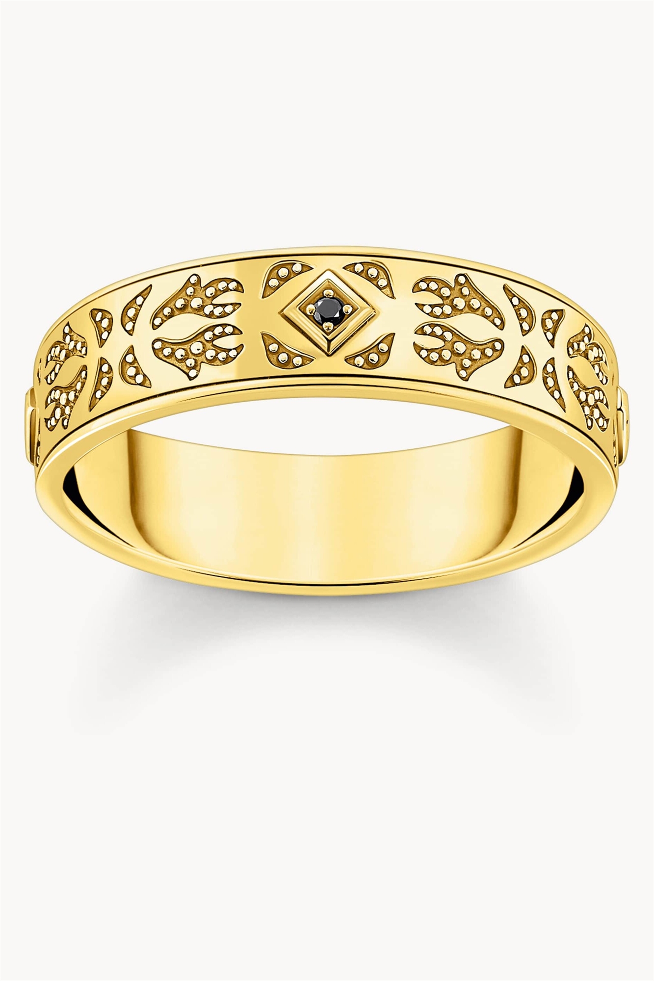 Кольцо с узорчатым ободом, покрытое позолотой, с черными цирконами