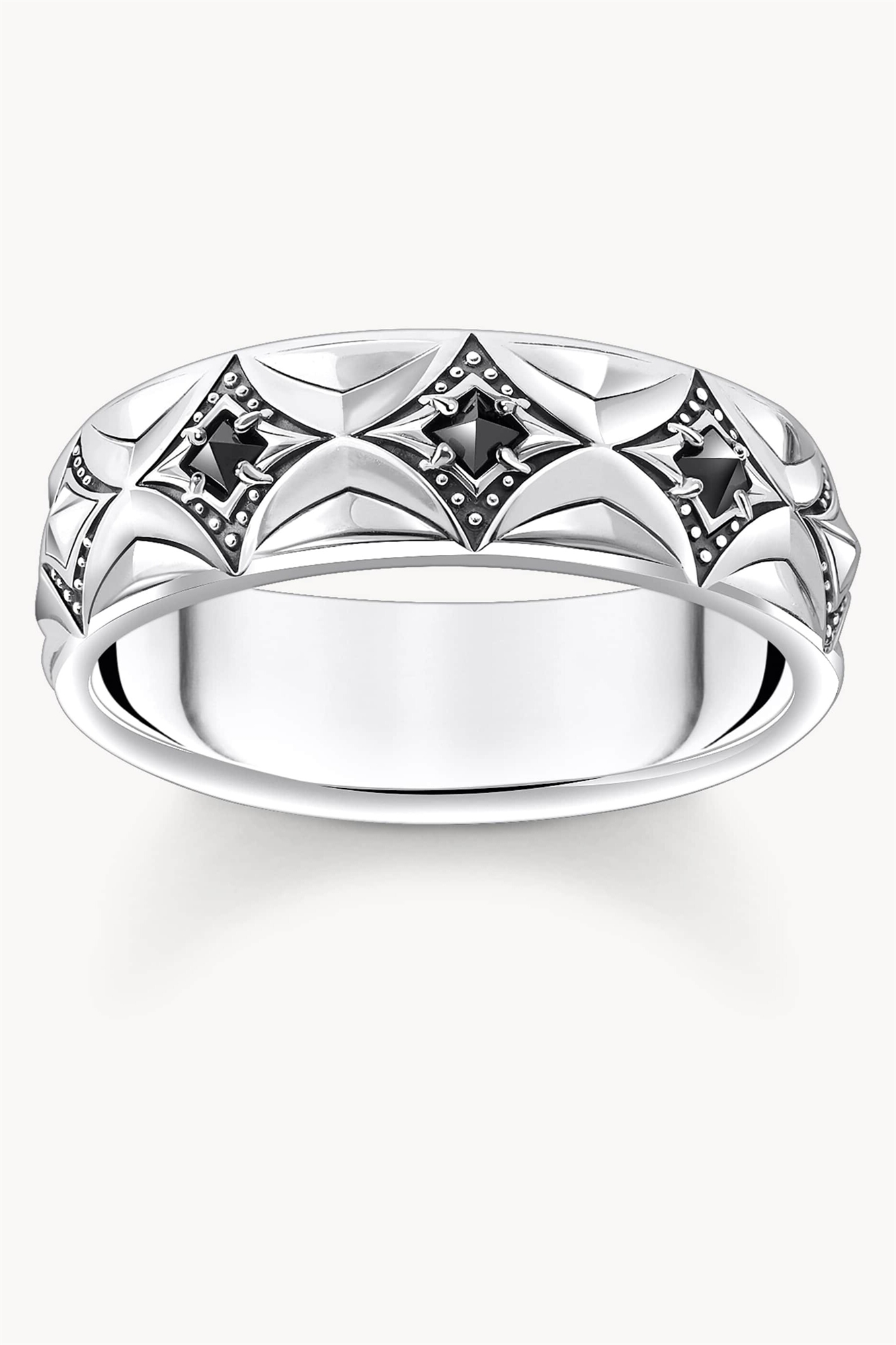 Серебряное кольцо с черненым покрытием, ромбовидным узором и цирконами