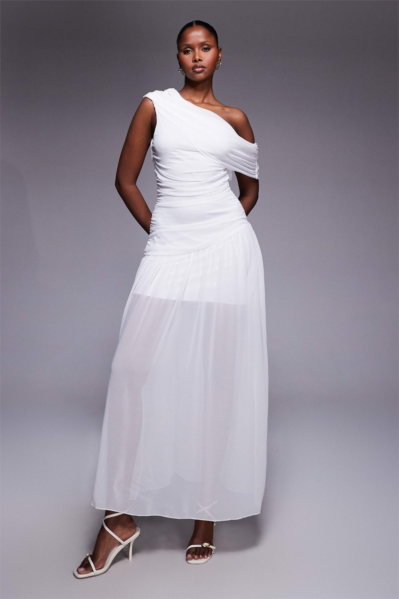 Эксклюзивное макси-платье из шифона с открытыми плечами, асимметричным кроем и сборками на прозрачном подоле